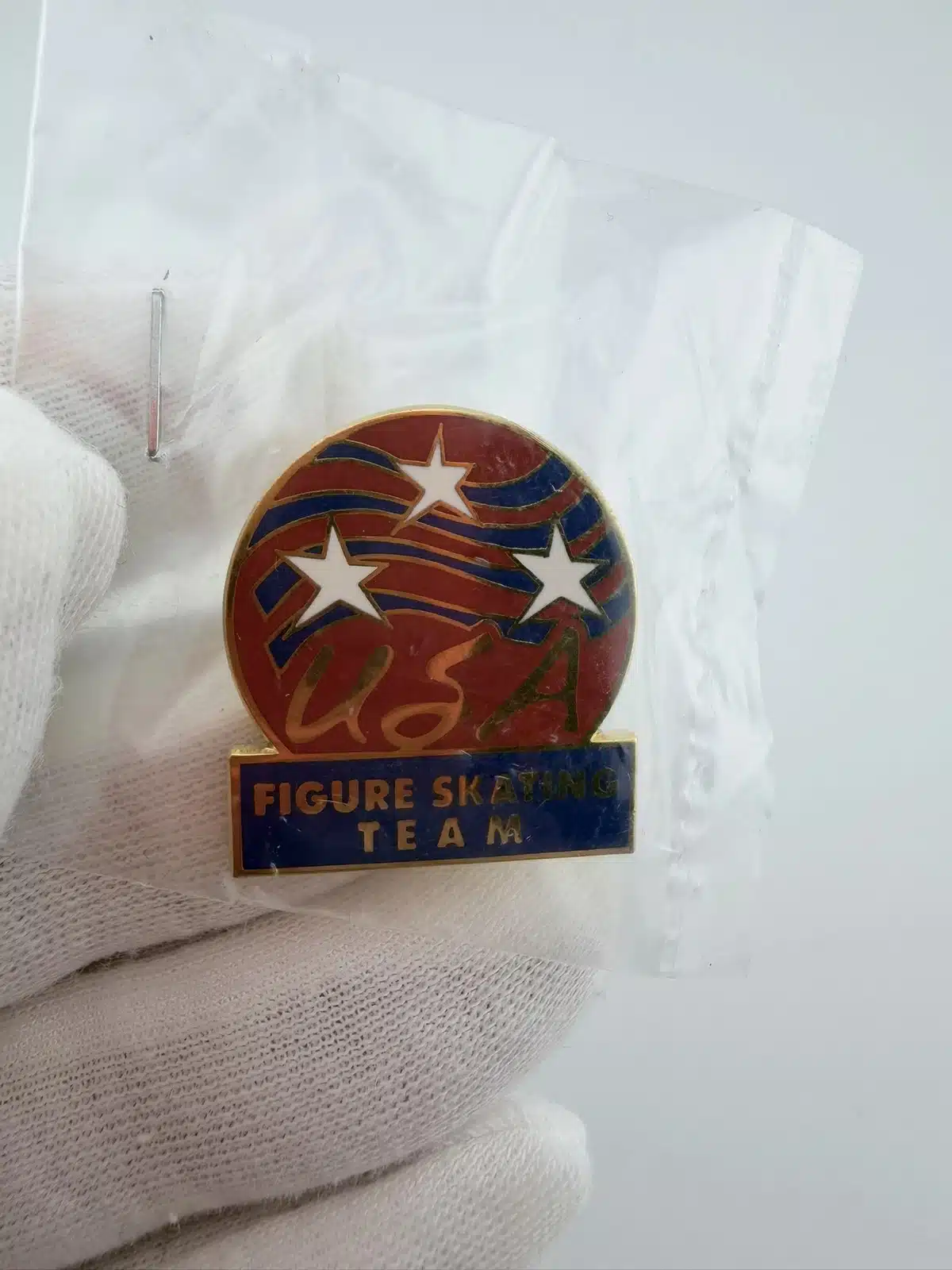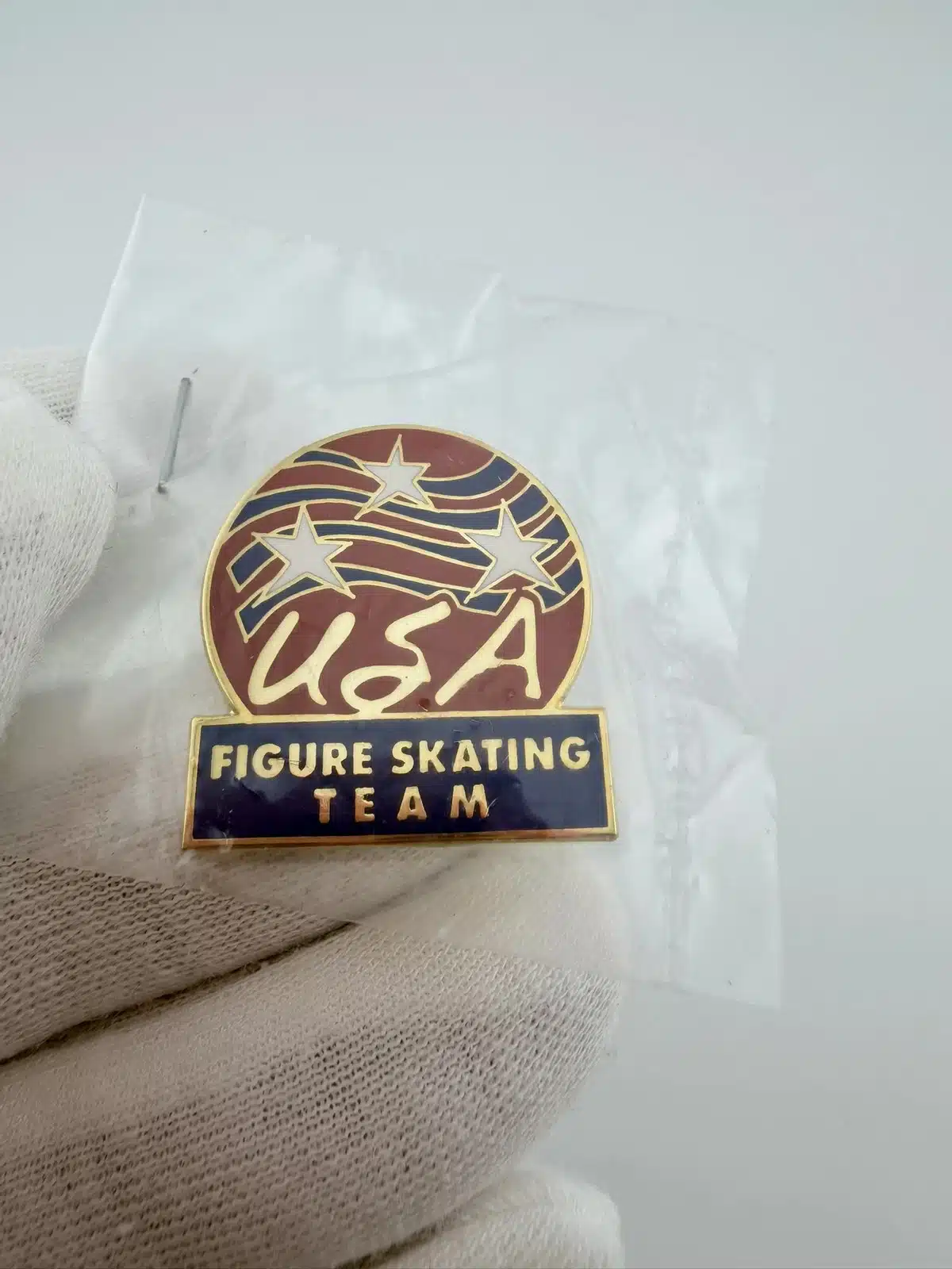 This pin features wavy blue stripes and white stars, embodying the patriotic spirit of Team USA. The cursive ‘USA’ is prominently displayed above the text ‘FIGURE SKATING TEAM’ at the bottom, celebrating the sport and its athletes during the year 2000.