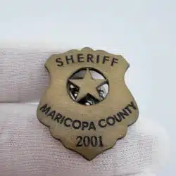 This 2001 Maricopa County Sheriff lapel hat pin features a classic sheriff’s badge design, prominently displaying the word ‘Sheriff’ at the top and ‘Maricopa County 2001’ at the bottom. The central circle contains a star with an intricate cut-out design, making it a distinctive piece of law enforcement memorabilia.