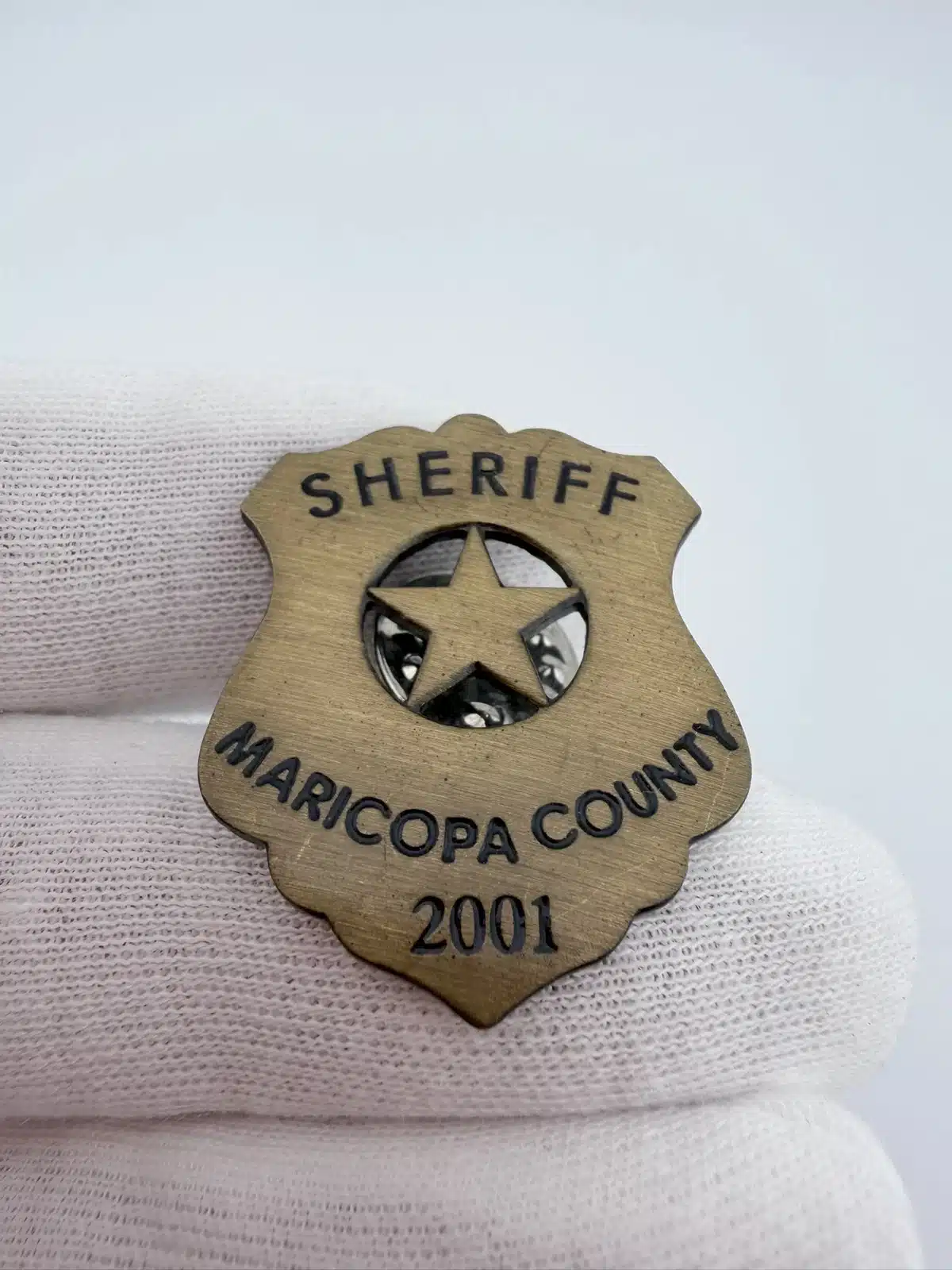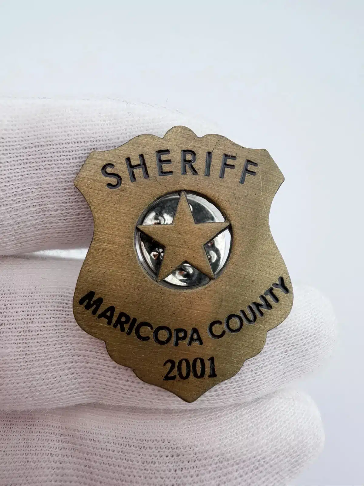 This 2001 Maricopa County Sheriff lapel hat pin features a classic sheriff’s badge design, prominently displaying the word ‘Sheriff’ at the top and ‘Maricopa County 2001’ at the bottom. The central circle contains a star with an intricate cut-out design, making it a distinctive piece of law enforcement memorabilia.