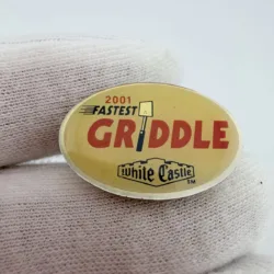 This pin has an oval shape with the White Castle logo at the bottom. Above it reads “2001 Fastest Griddle.”