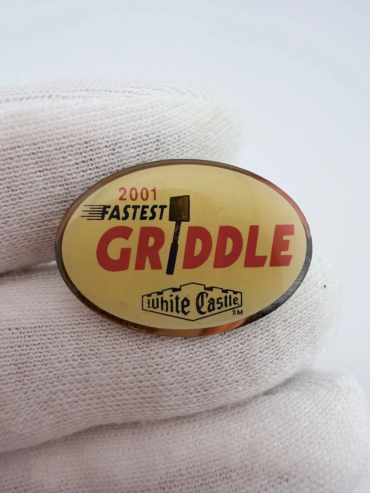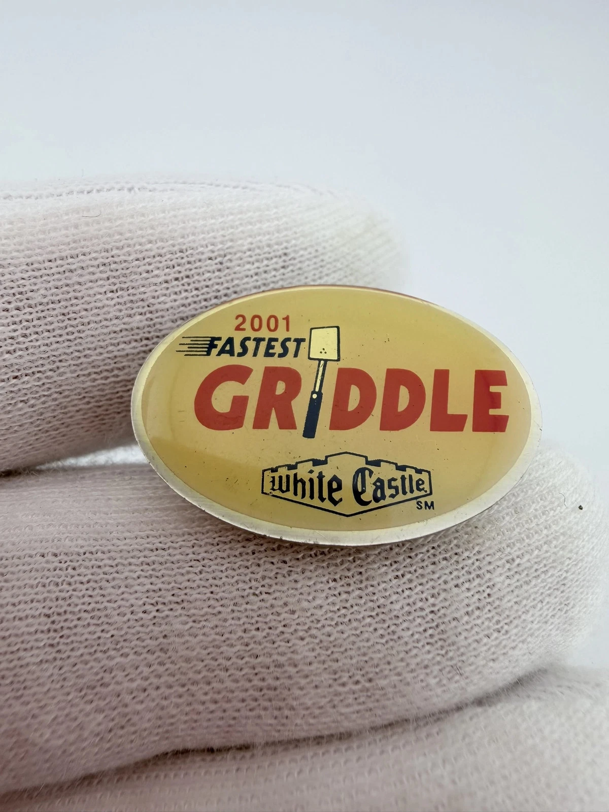 This pin has an oval shape with the White Castle logo at the bottom. Above it reads “2001 Fastest Griddle.”