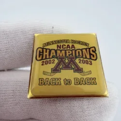 This pin has a square design with a gold tone finish. It reads “NCAA Champions 2002 2003” and features the University of Minnesota “M” logo with two crossed hockey sticks positioned behind the letter, with “Back to Back” at the bottom.