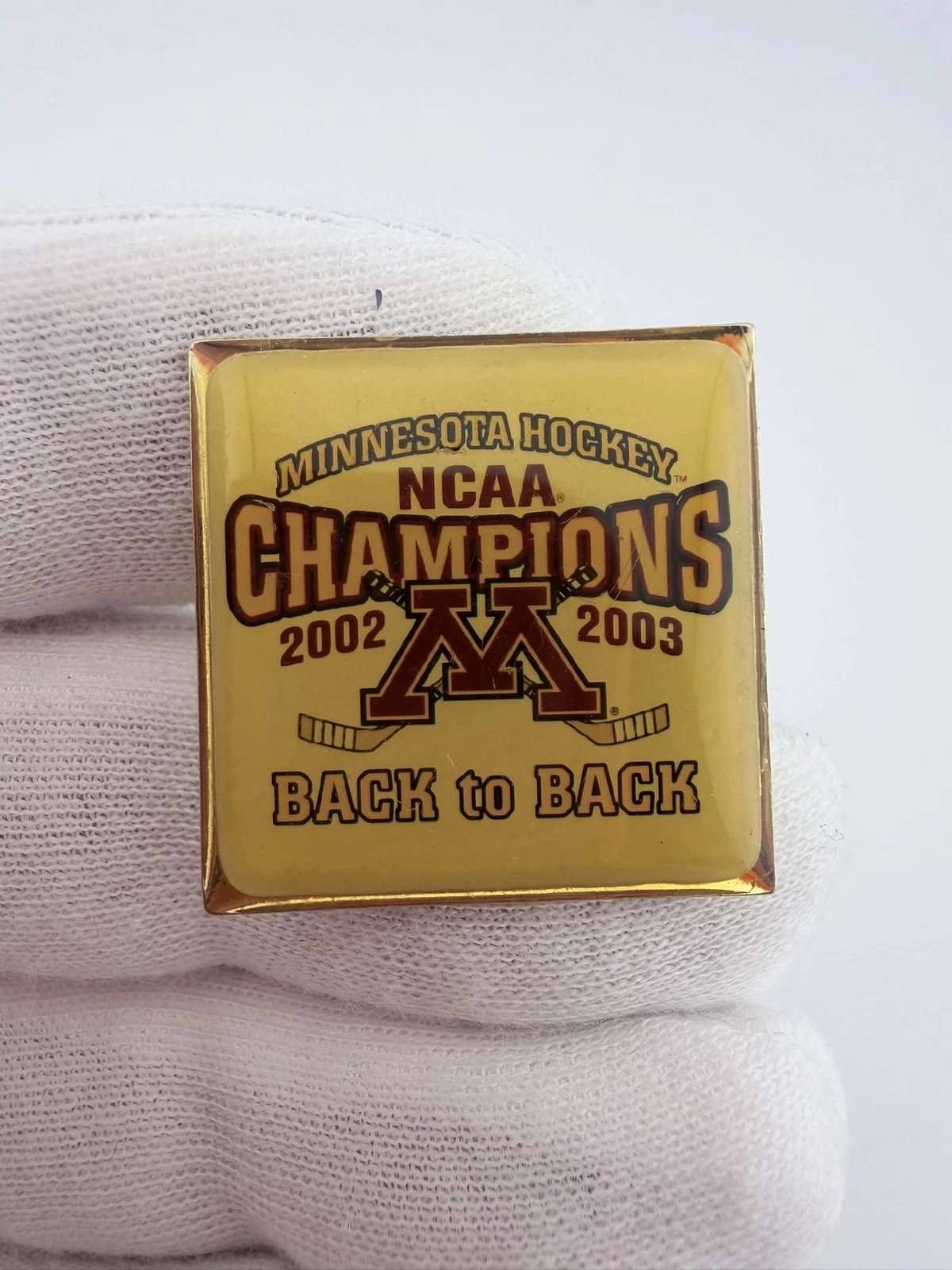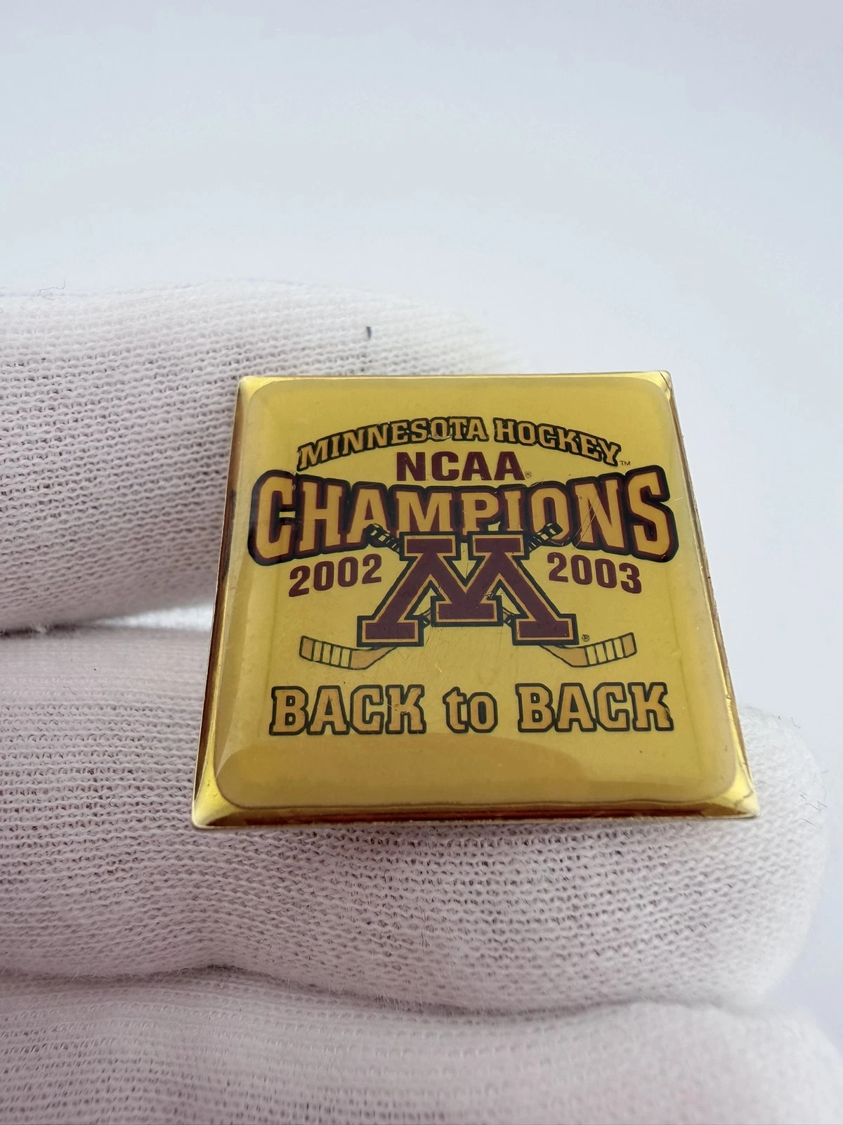 This pin has a square design with a gold tone finish. It reads “NCAA Champions 2002 2003” and features the University of Minnesota “M” logo with two crossed hockey sticks positioned behind the letter, with “Back to Back” at the bottom.