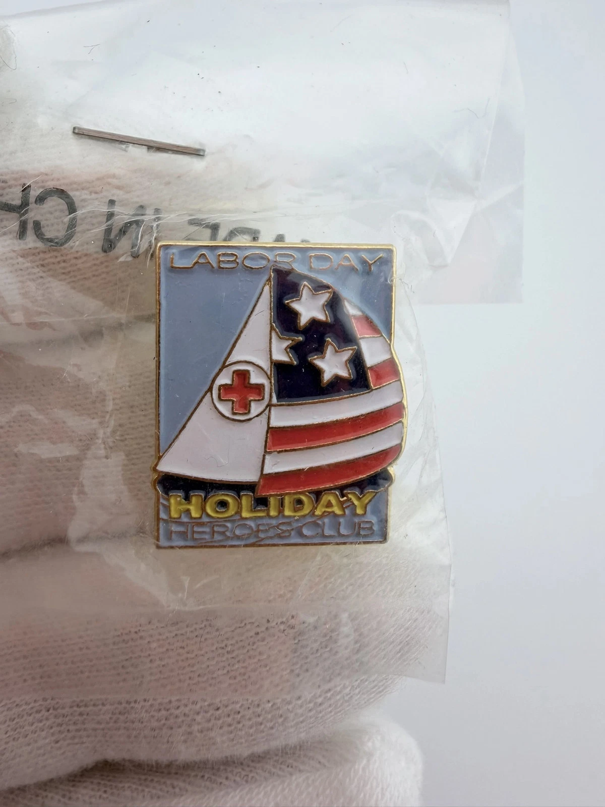 This American Red Cross Holiday Heroes pin recognizes Labor Day in 2002. The pin features a sailboat design with one sail displaying the American flag and another white sail bearing the red cross symbol, with “Labor Day” at the top and “Holiday Heroes Club” at the bottom. These pins were given to blood donors on Labor Day in 2002 only.