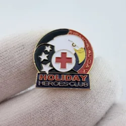This American Red Cross Holiday Heroes pin recognizes blood donation on Memorial Day in 2002. The pin features a strong eagle design with three white stars and a red cross symbol below the face, with “Holiday Heroes Club” at the bottom and “Memorial Day” on the right side.
