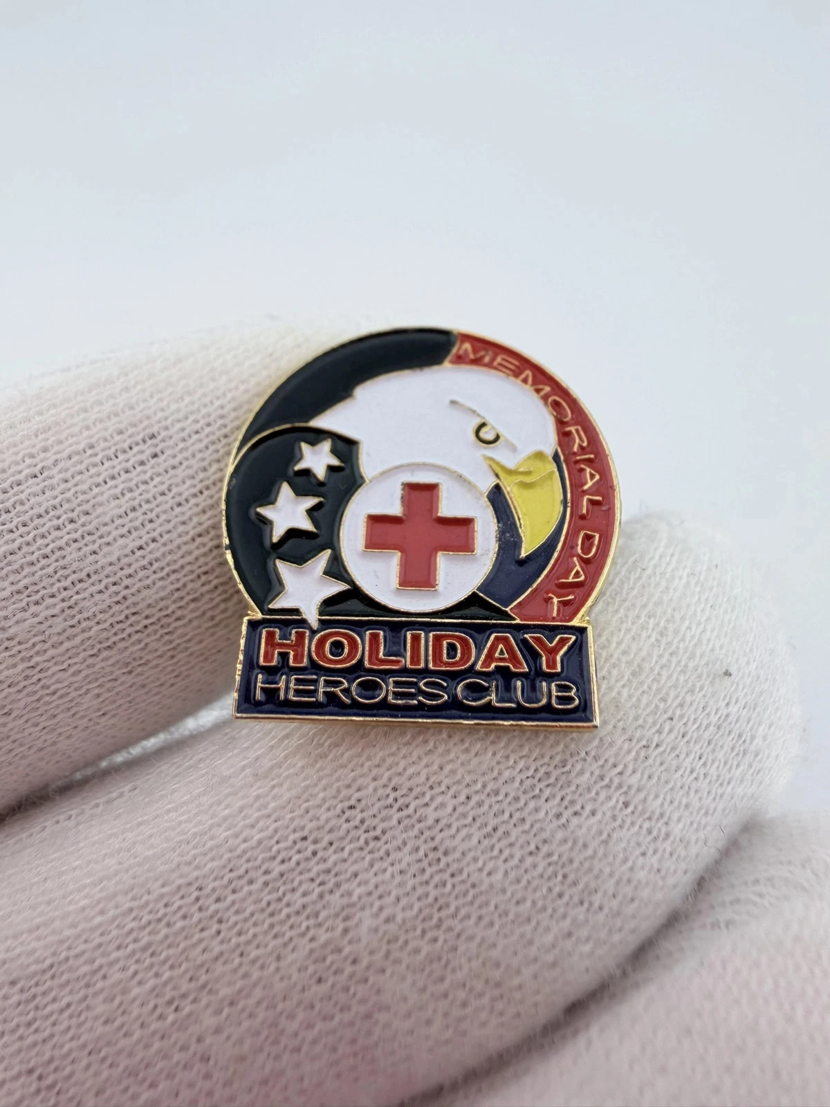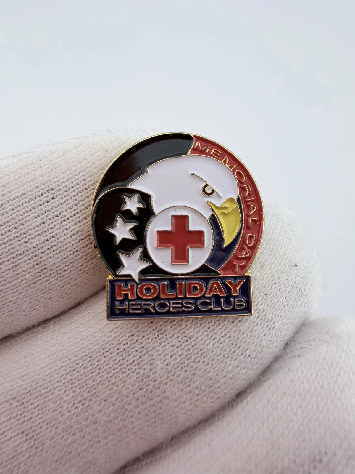 This American Red Cross Holiday Heroes pin recognizes blood donation on Memorial Day in 2002. The pin features a strong eagle design with three white stars and a red cross symbol below the face, with “Holiday Heroes Club” at the bottom and “Memorial Day” on the right side.