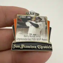 This pin commemorates Barry Bonds’ remarkable achievement of winning his 5th MVP award in 2002, featuring the San Francisco Giants’ iconic orange and black at top, a photo of Barry hitting, and more. The design highlights Bonds’ in action, capturing the essence of his celebrated career and significant milestone in Major League Baseball history.