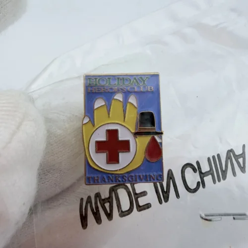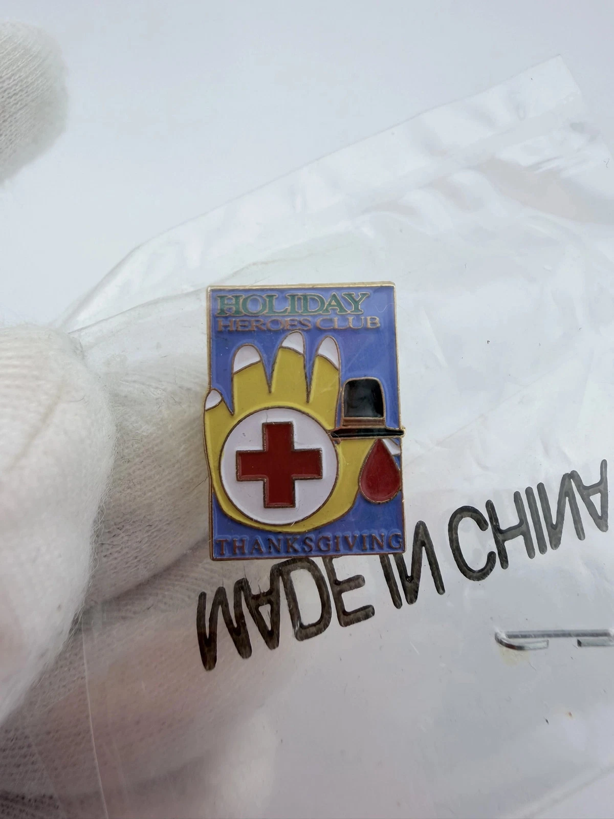 This American Red Cross Holiday Heroes pin recognizes the Thanksgiving holiday in 2003. The pin features a blue background with a yellow and white turkey formed from the shape of a human hand, including a red cross symbol on the hand and a festive hat on the thumb, along with a small red droplet. These pins were given to blood donors on Thanksgiving.
