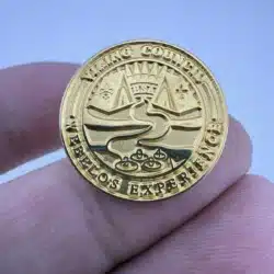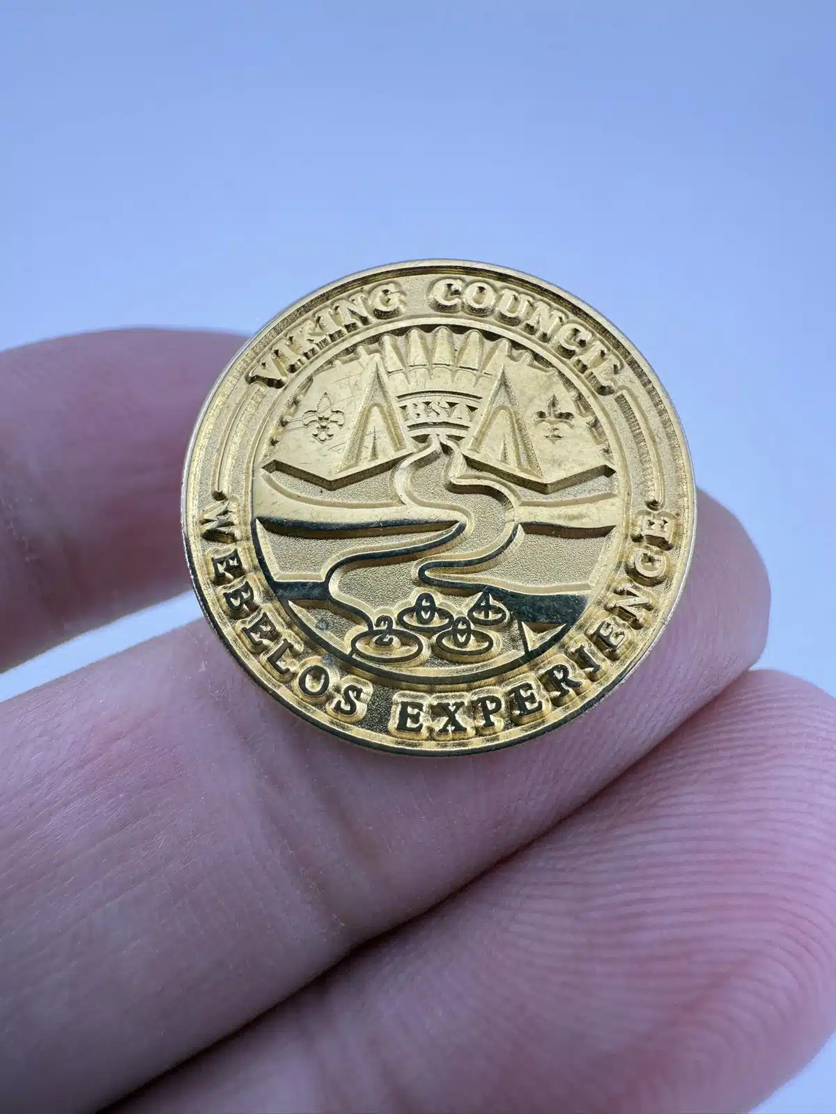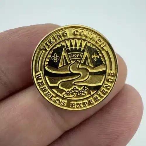 This pin features a scenic campground with a flowing stream, rising sun, and two tents with emblem of the Boy Scouts of America on them. The gold tone pin was issued for the Viking Council’s 2004 Webelos Experience event.