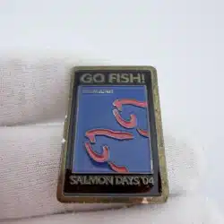This vibrant lapel pin from the 2004 Issaquah Salmon Days features a playful ‘Go Fish!’ design, celebrating the annual festival dedicated to salmon and local culture in Washington State. The pin showcases colorful imagery that reflects the event’s focus on the significance of salmon in the region.