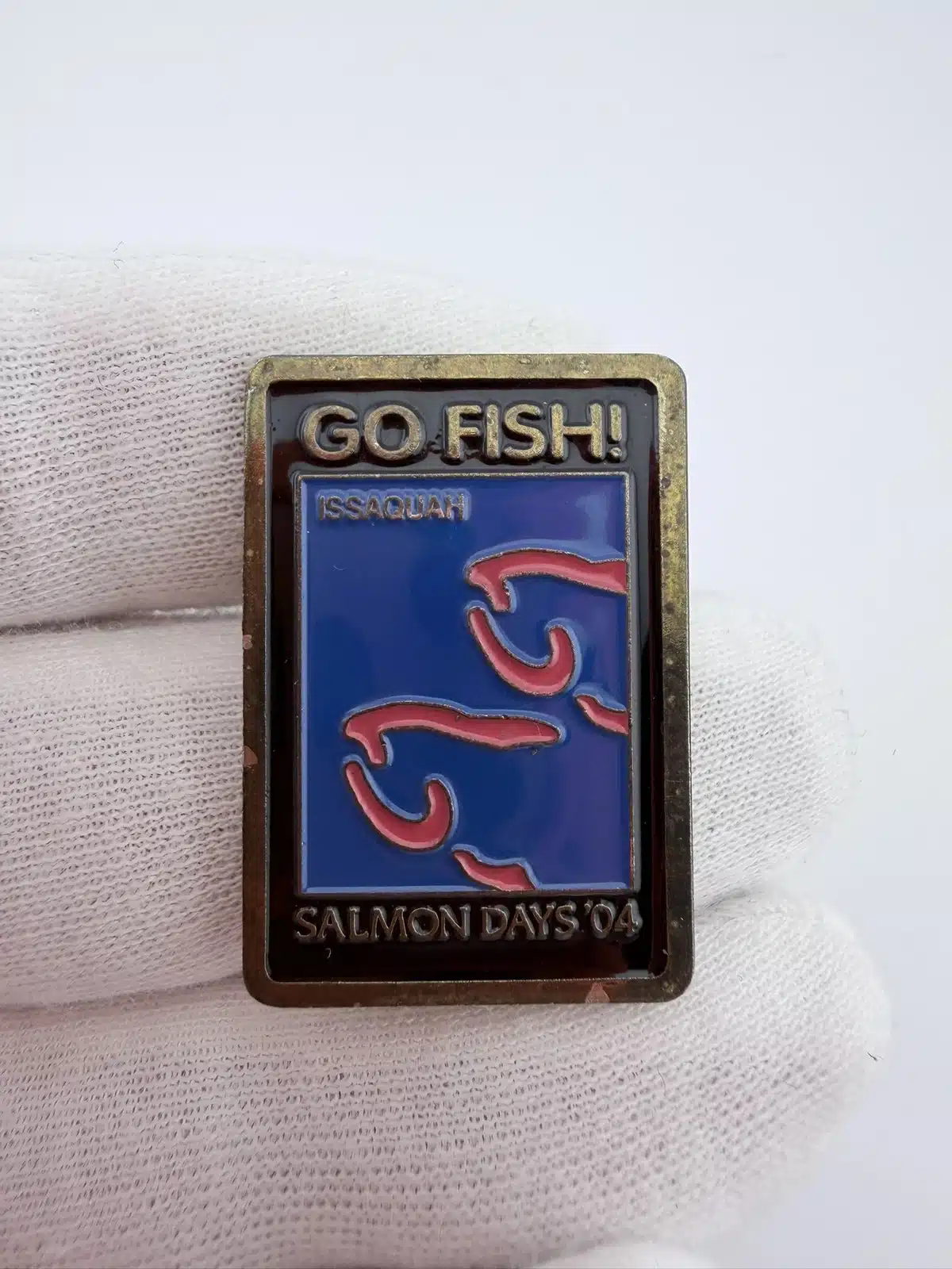 This vibrant lapel pin from the 2004 Issaquah Salmon Days features a playful ‘Go Fish!’ design, celebrating the annual festival dedicated to salmon and local culture in Washington State. The pin showcases colorful imagery that reflects the event’s focus on the significance of salmon in the region.