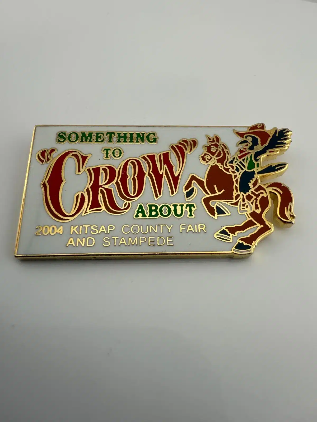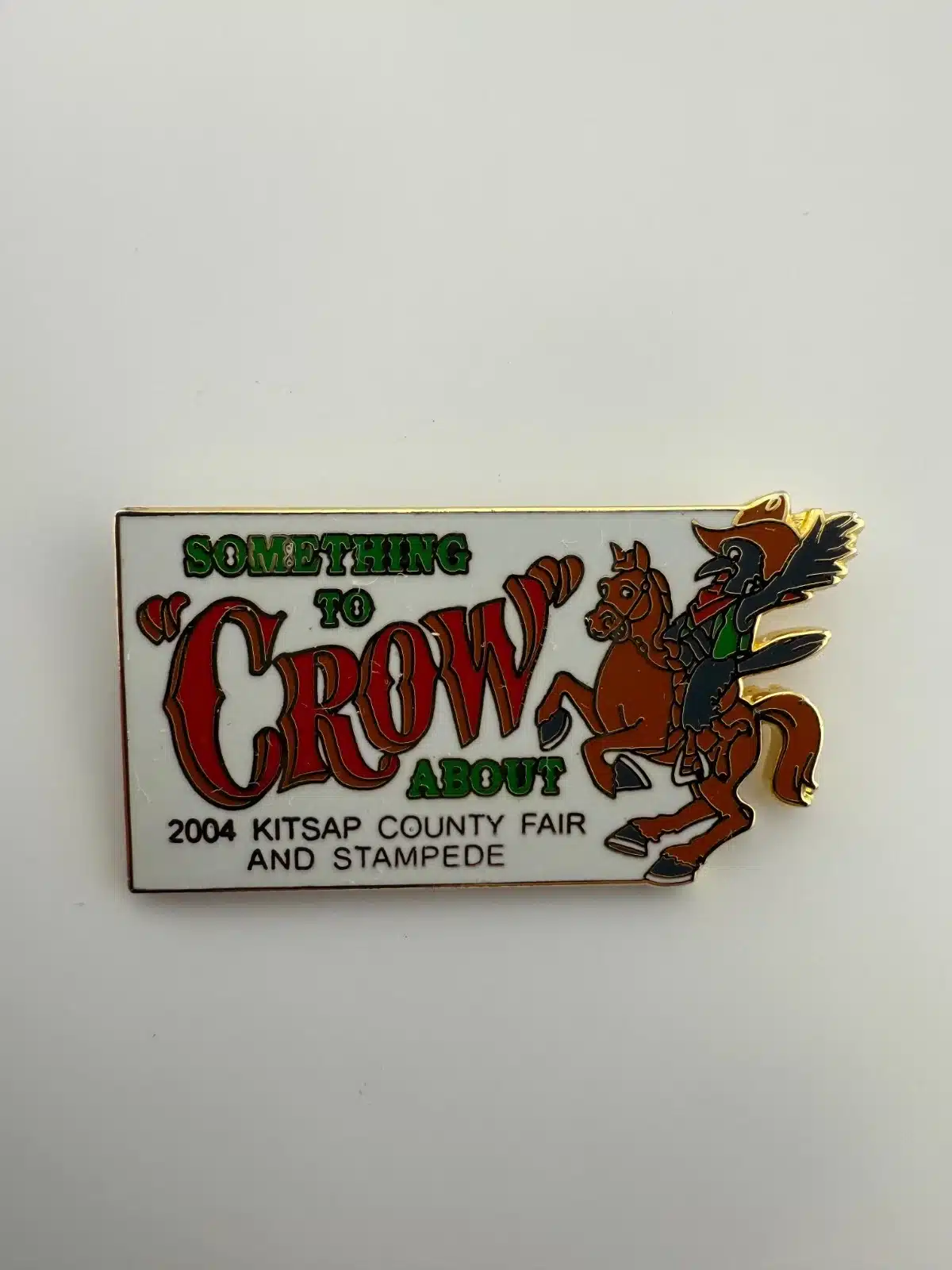 The 2004 Kitsap County Fair and Stampede Pin features a whimsical design of a crow riding a horse, celebrating the fair’s theme ‘Something To Crow About.’