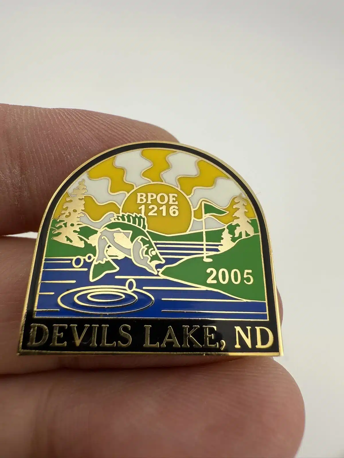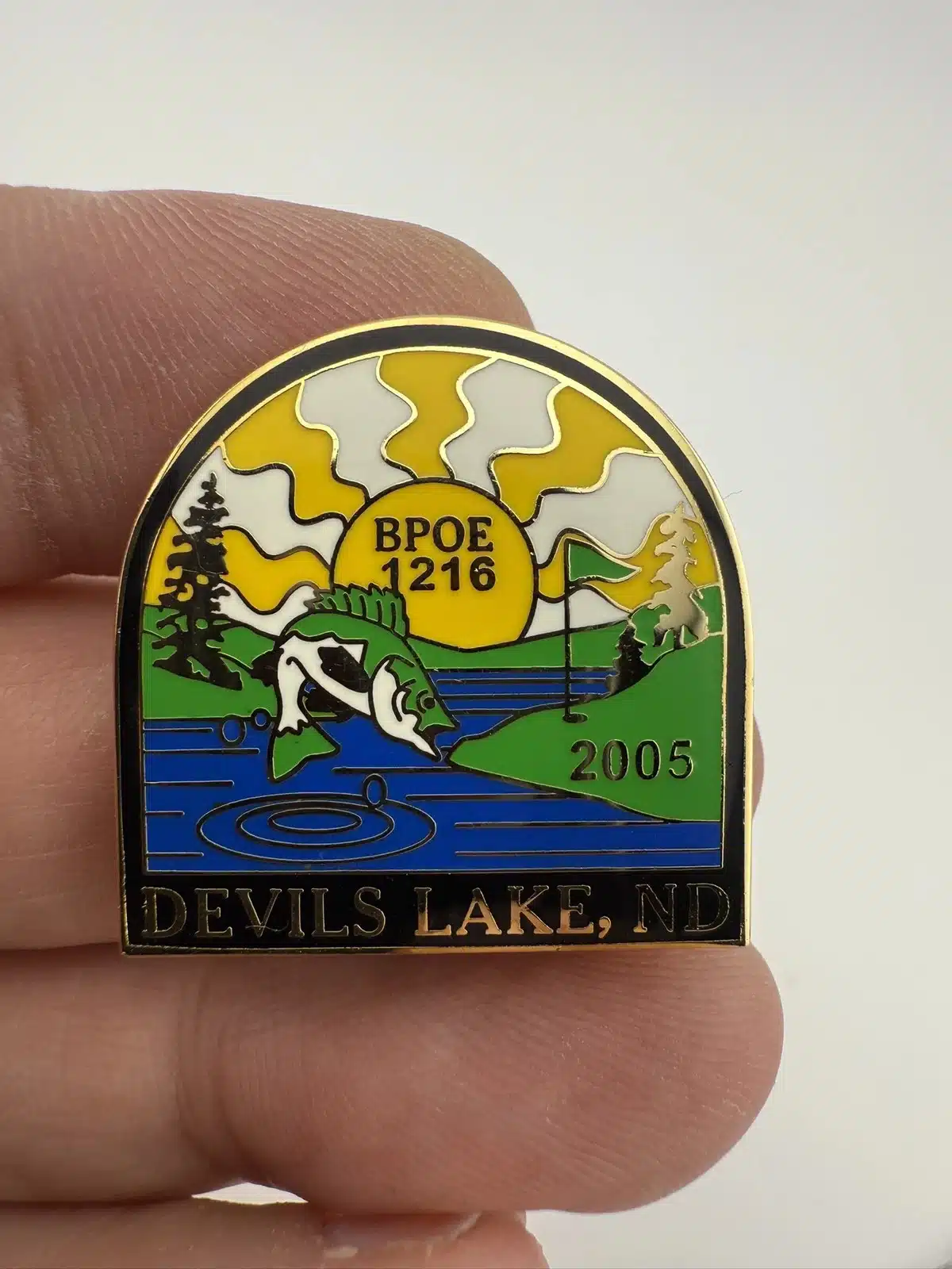 This 2005 Elks BPOE Lodge #1216 pin from Devils Lake, North Dakota features a detailed depiction of a fish jumping out of a stream, a golf hole marker on a course, trees, and a sun, showcasing the scenic beauty of the area.