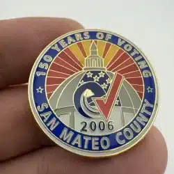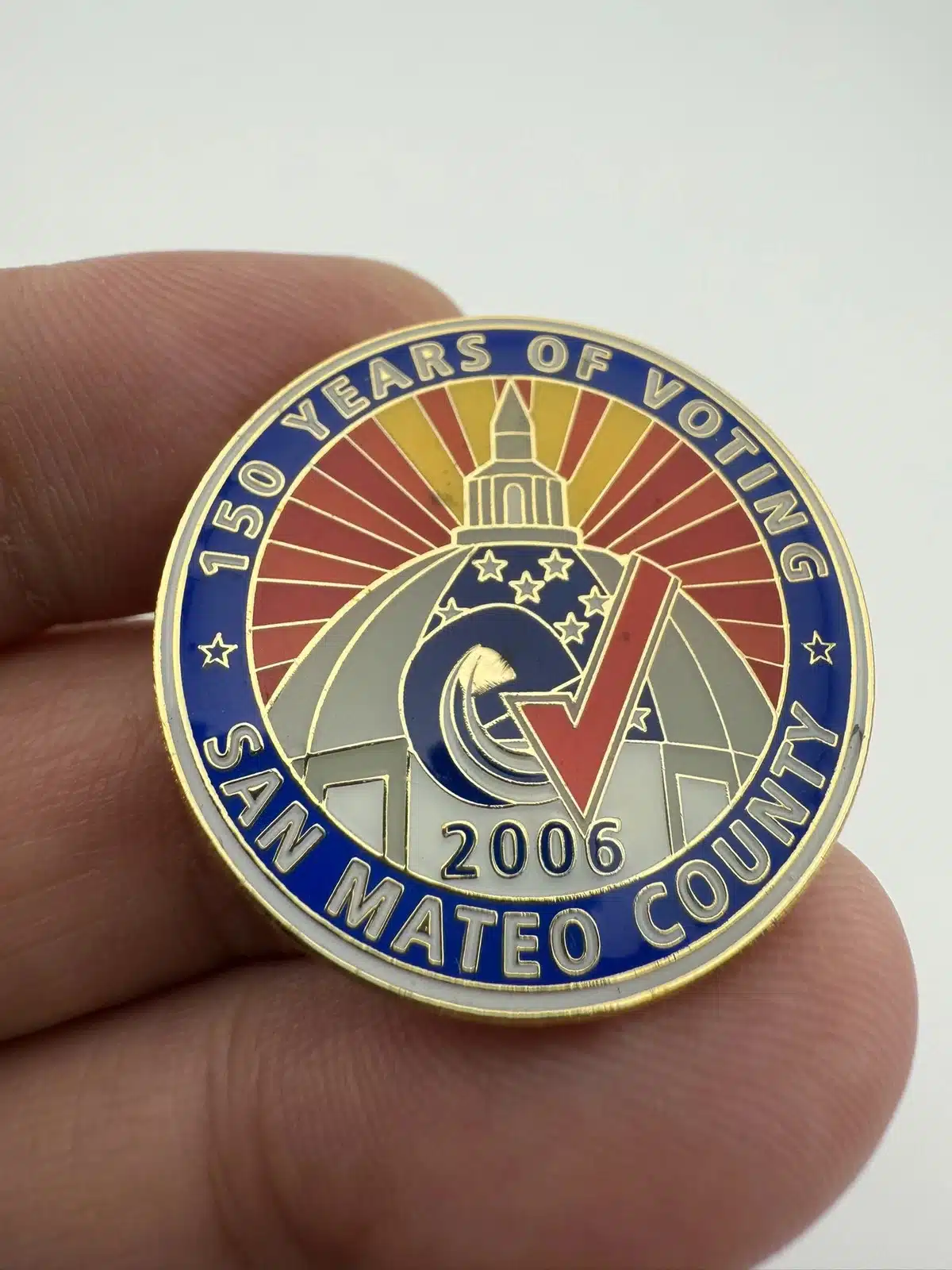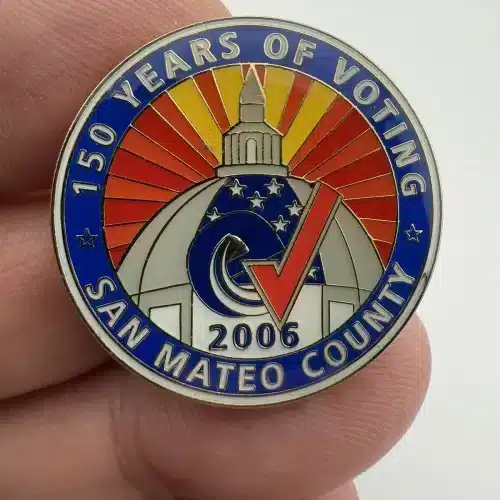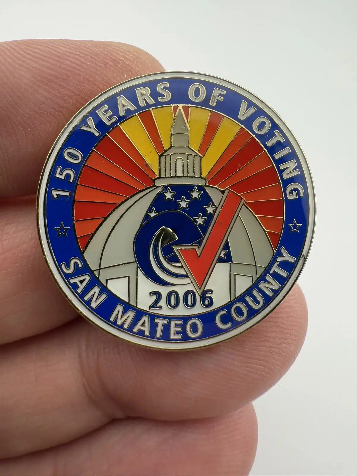 This pin commemorates the 150th anniversary of voting in San Mateo County, California, during 2006. It features an image of the state capitol in the background, highlighting a significant milestone in local electoral history.