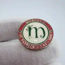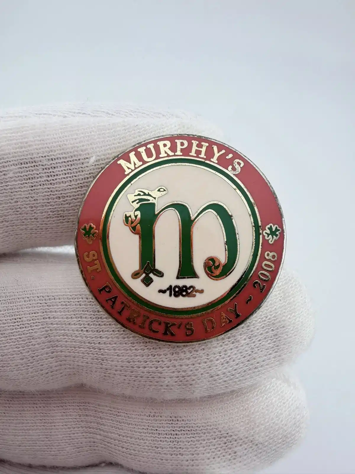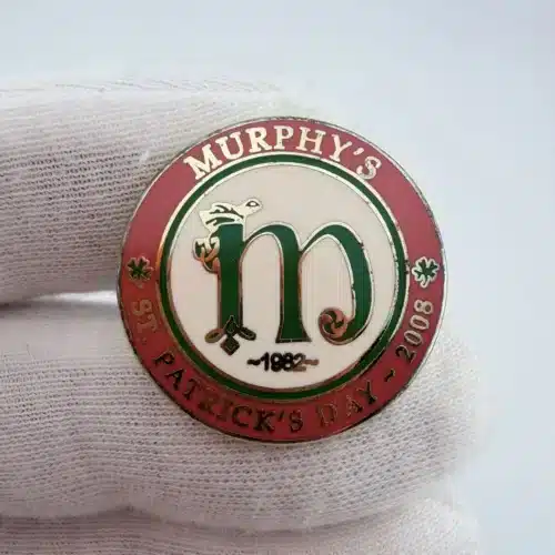 This Saint Patrick’s Day 2008 pin Murphy’s Irish Pub in Seattle, Washington features a circular design with “Murphy’s” across the top of the inner ring and “St. Patrick’s Day – 2008” along the bottom. At the center is a stylized “M” representing the pub’s logo.