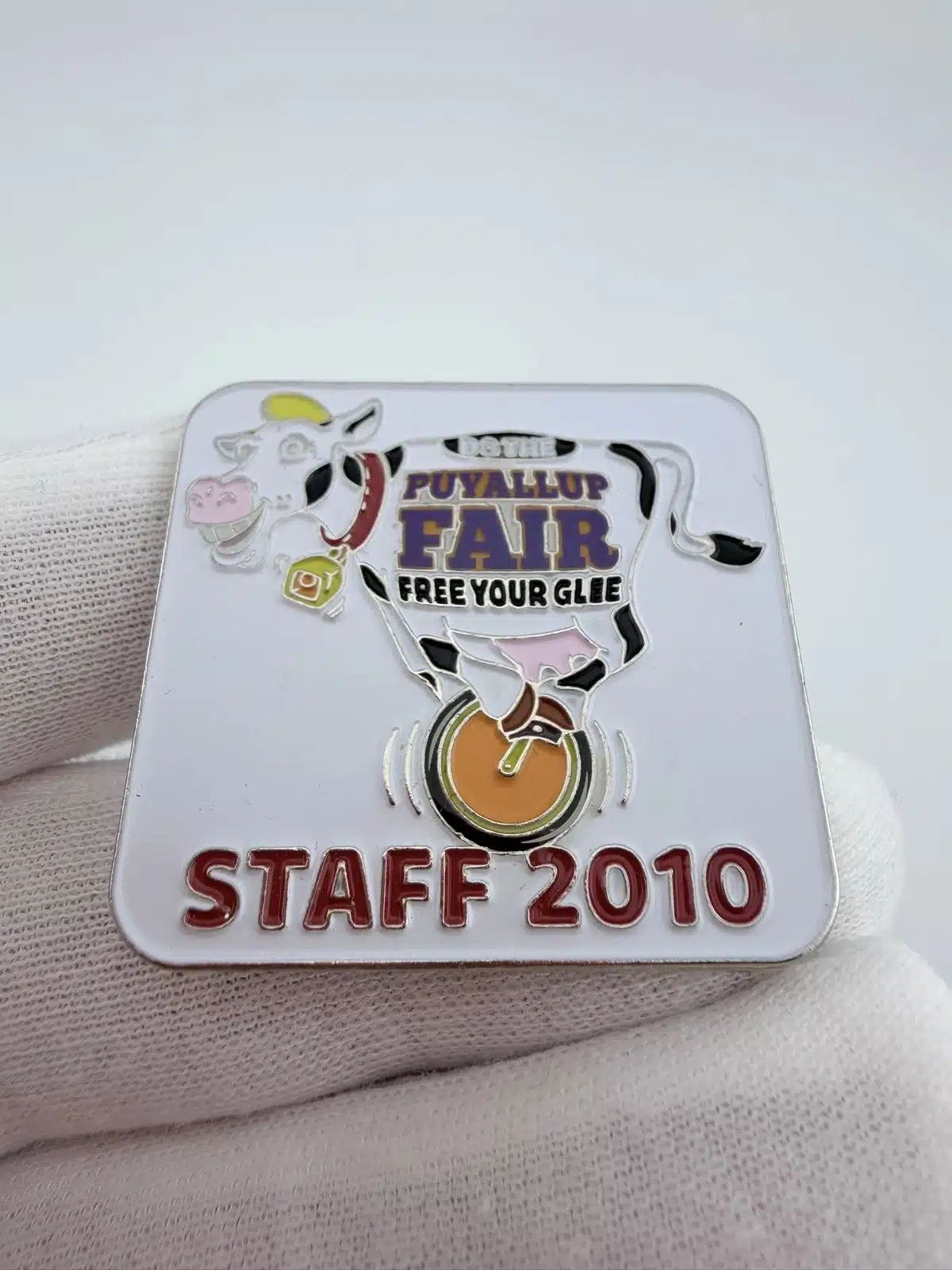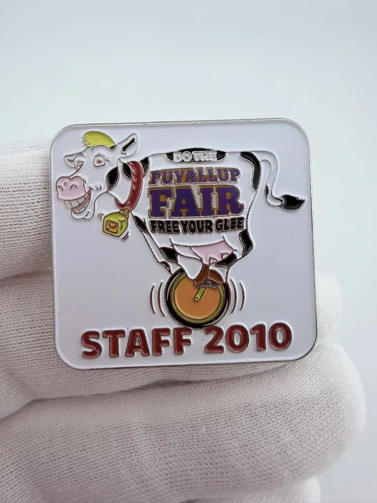 This vibrant 2010 Puyallup Fair staff pin features a cheerful cow balancing on a unicycle, capturing the playful and lighthearted spirit long associated with the fair. The words “Puyallup Fair” appear in bold purple lettering across the cow’s side, making the event branding a central part of the design.