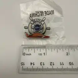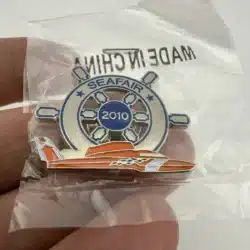 This 2010 Seafair lapel hat pin features a detailed captain’s wheel alongside a striking orange hydroplane, symbolizing the maritime heritage of Seattle’s annual summer festival. The design captures the excitement of hydroplane racing, a key event in the Seafair celebration, which has been a beloved tradition since 1950.