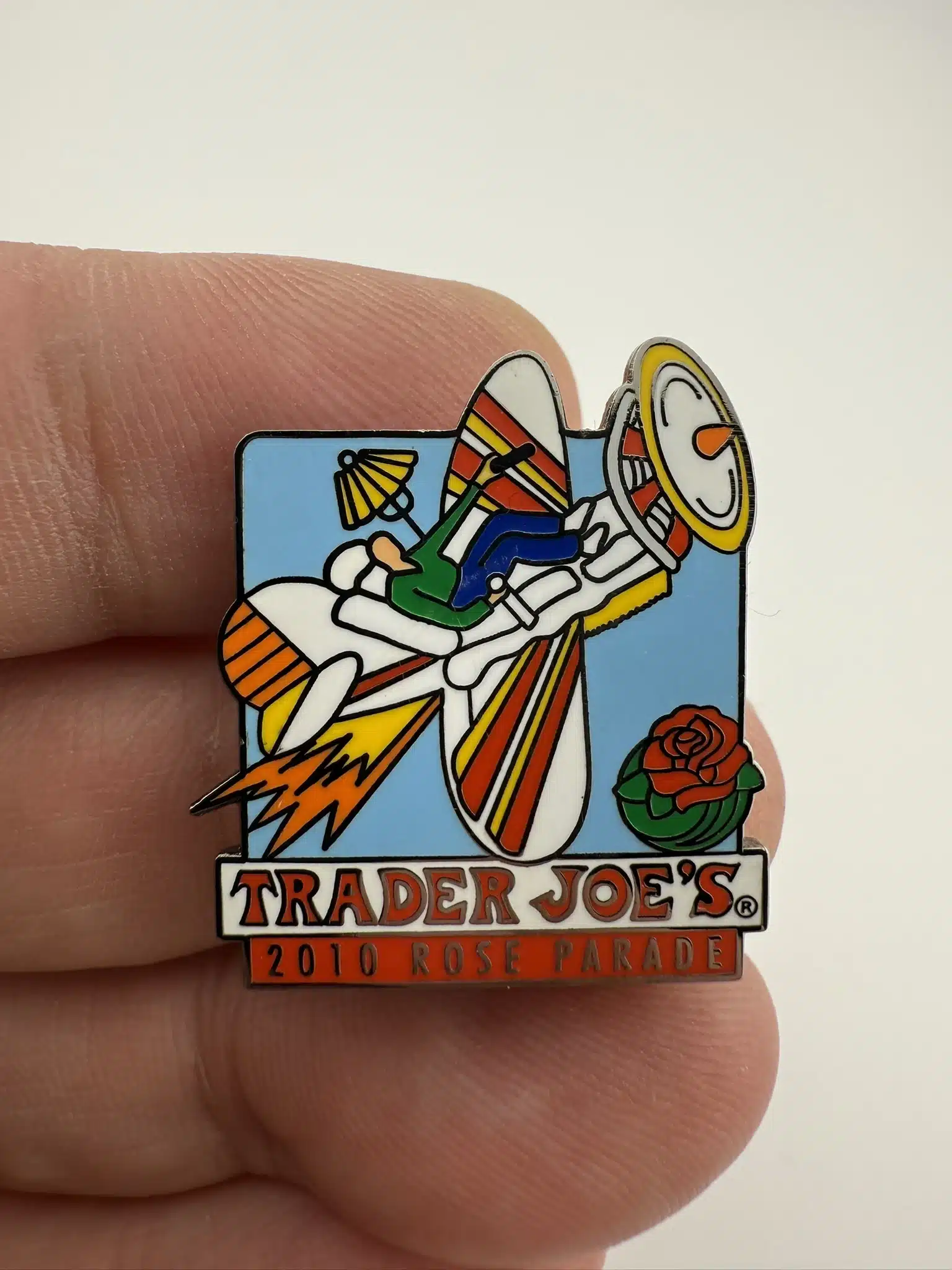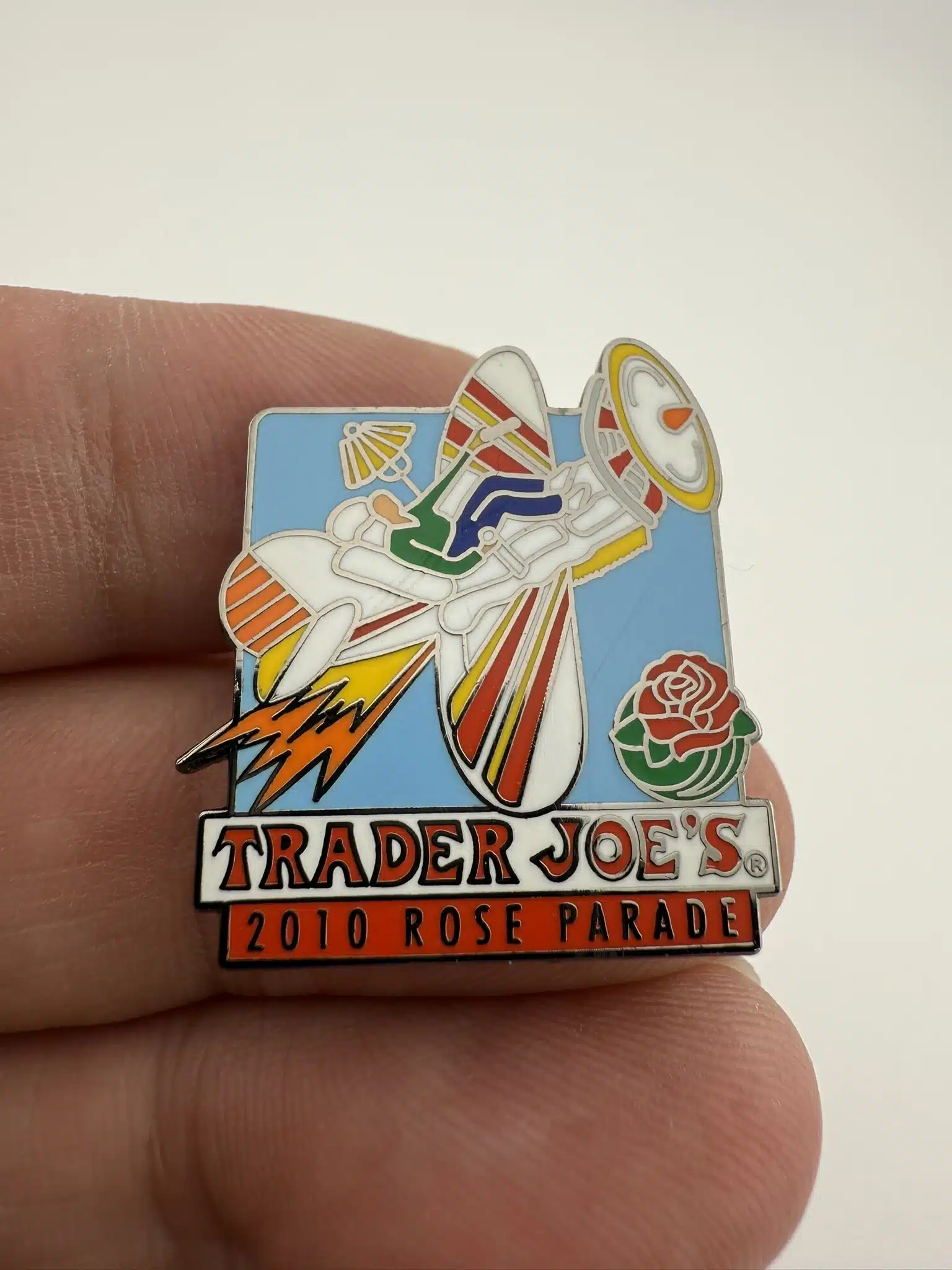This 2010 Trader Joe’s Rose Parade pin features a colorful airplane design, capturing the festive spirit of the annual event. The pin commemorates Trader Joe’s participation in the Rose Parade, a beloved tradition held in Pasadena, California, since 1890.