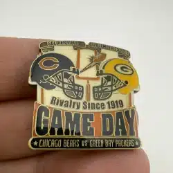 This collectible pin commemorates the historic rivalry between the Green Bay Packers and the Chicago Bears, featuring the date of their matchup on September 25, 2011. The design showcases the team helmets facing one another, encapsulating the spirit of one of the NFL’s oldest and most storied rivalries.