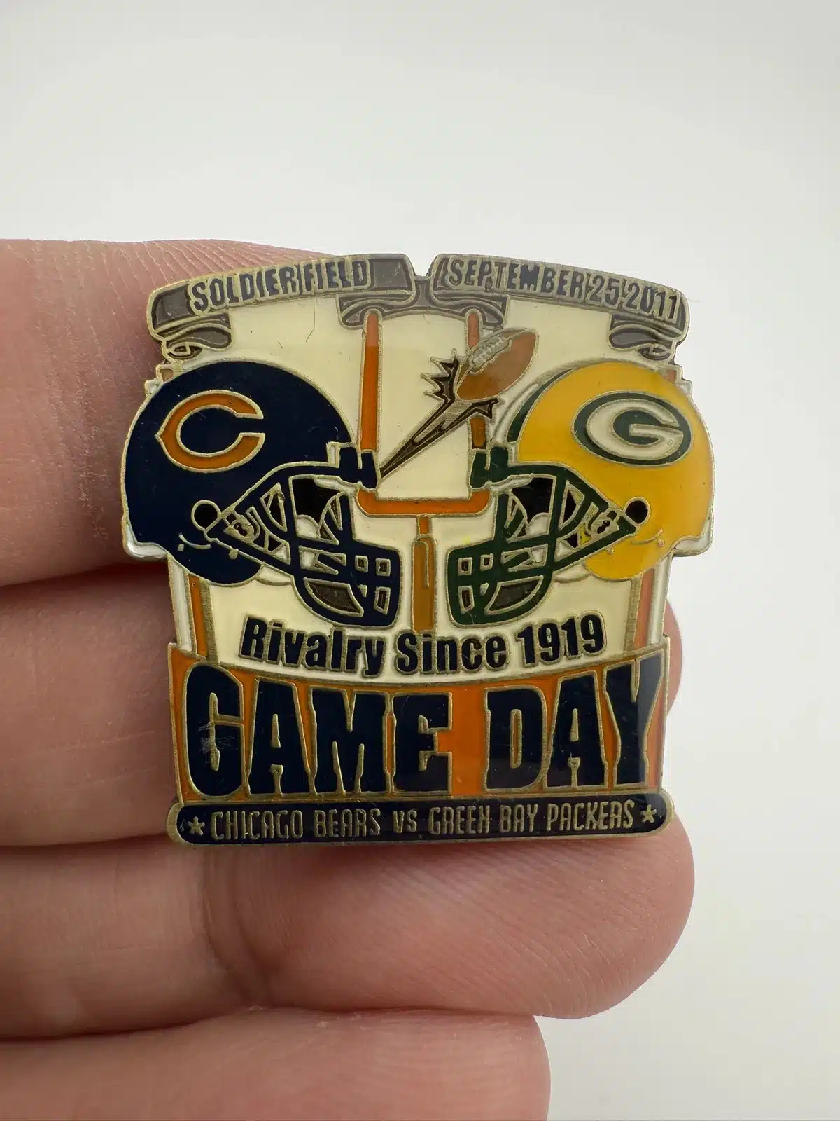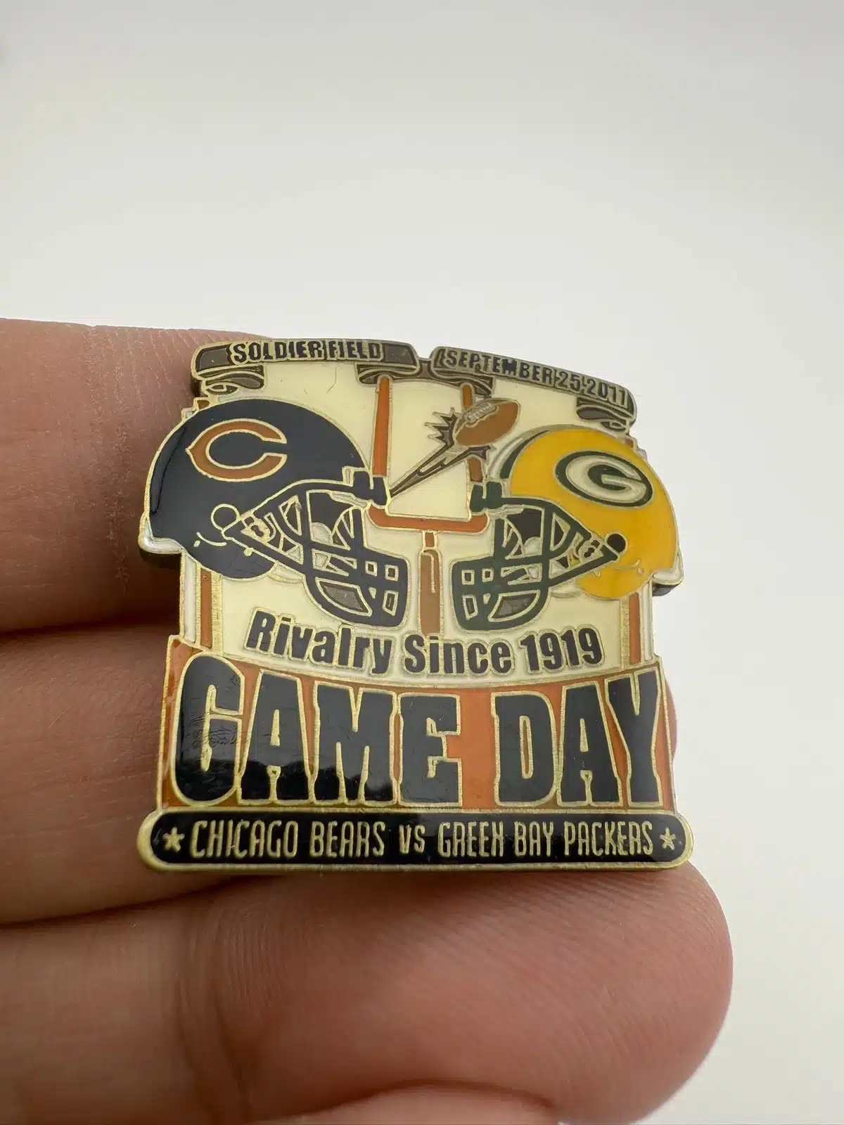 This collectible pin commemorates the historic rivalry between the Green Bay Packers and the Chicago Bears, featuring the date of their matchup on September 25, 2011. The design showcases the team helmets facing one another, encapsulating the spirit of one of the NFL’s oldest and most storied rivalries.