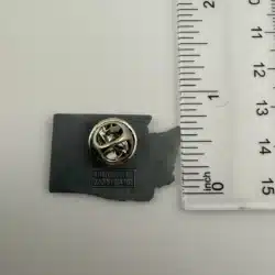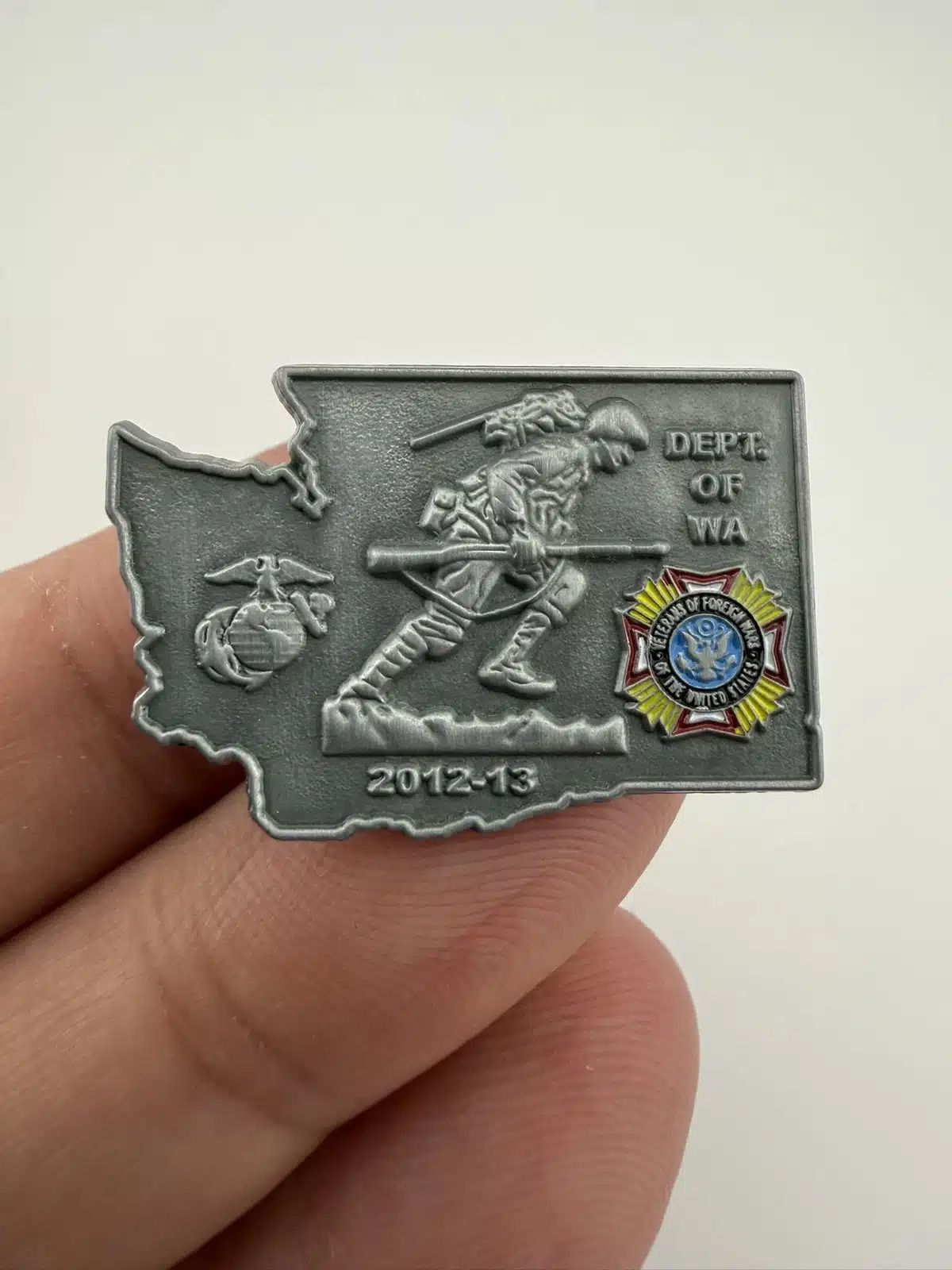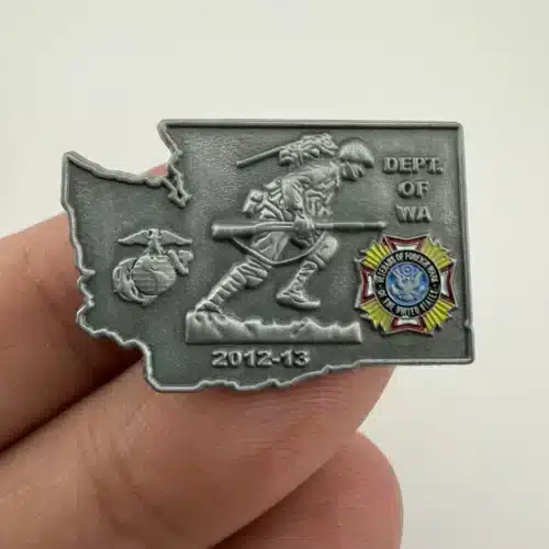 This pin is shaped like the state of Washington, featuring a soldier carrying a rifle prominently in the center, symbolizing the service and sacrifice of veterans. The design also includes the Marine Corps emblem on the left and the Veterans of Foreign Wars (VFW) logo on the right, reflecting the organization’s commitment to supporting those who have served.
