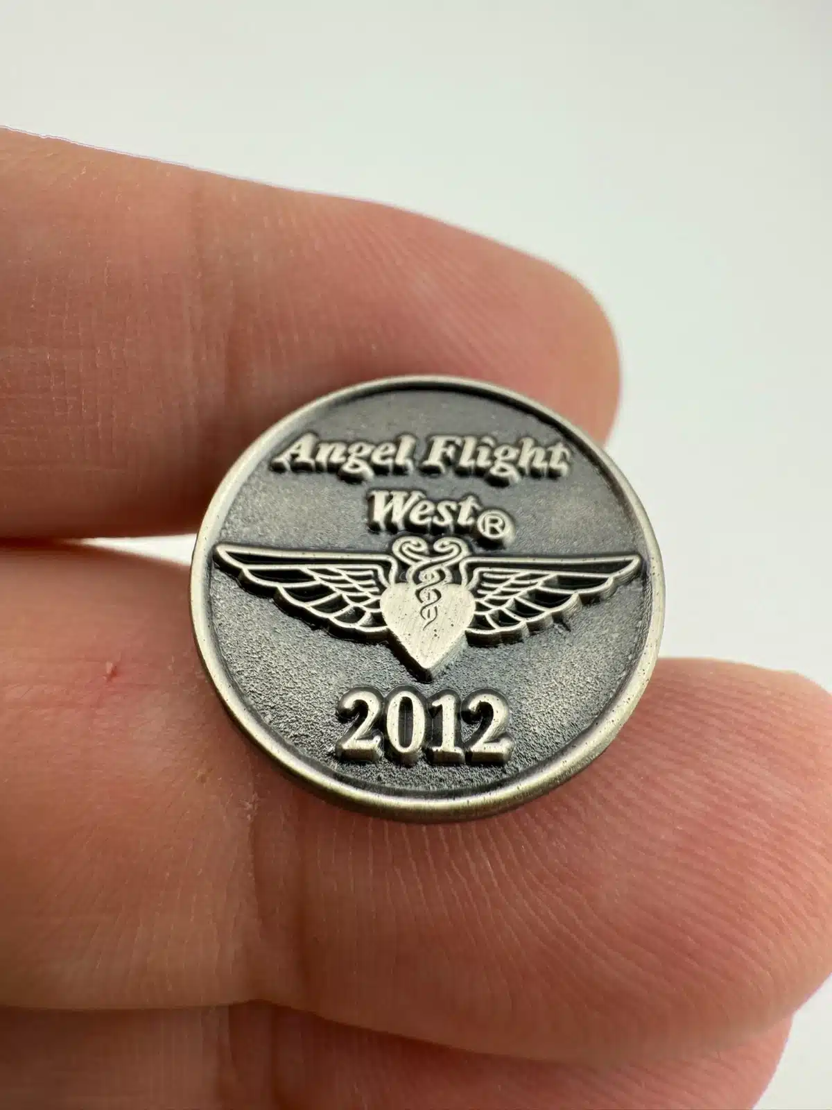 Angel Flight West is a nonprofit organization that coordinates free air transportation for patients in need of medical care, with themed pins like this tied to their Flights of Hope mission. Pin measures approximately 3/4 inch in diameter.