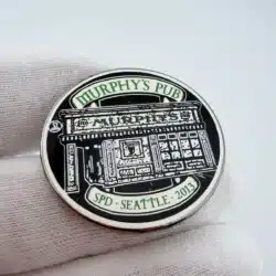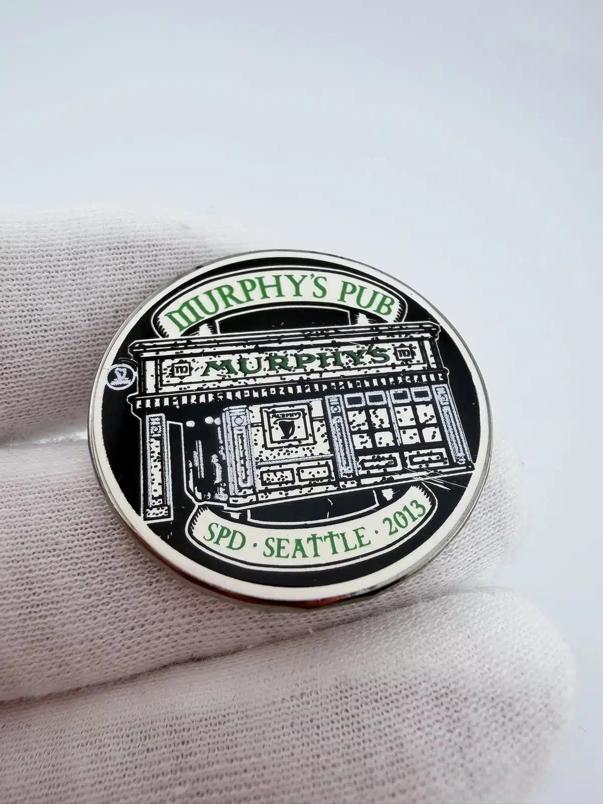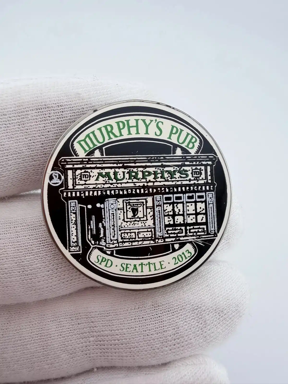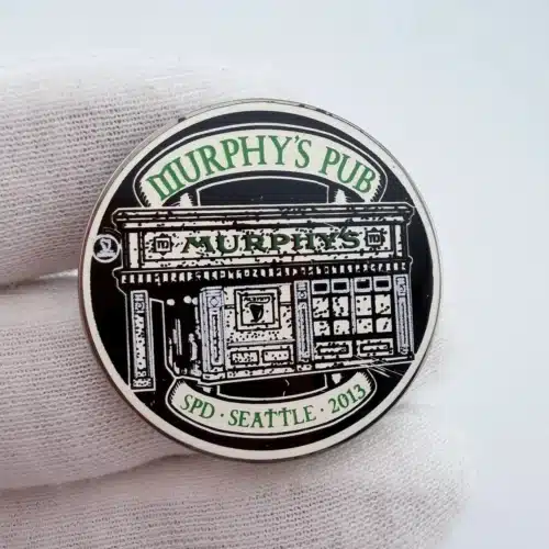 This Murphy’s Irish Pub Saint Patrick’s Day 2013 pin features a circular design with a black background and an illustration of the Murphy’s Pub facade located in Seattle’s Wallingford neighborhood on 45th. The design commemorates the pub’s annual Saint Patrick’s Day celebrations, a major event for the well-known Irish bar and gathering spot.