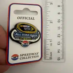 This pin commemorates the 2013 NASCAR Sprint Cup Series All-Star Race held at Charlotte Motor Speedway, an annual exhibition event featuring top drivers in a non-points competition. Pin measures just under 1 1/2 inch in width by approximately 1 1/4 inch in height.