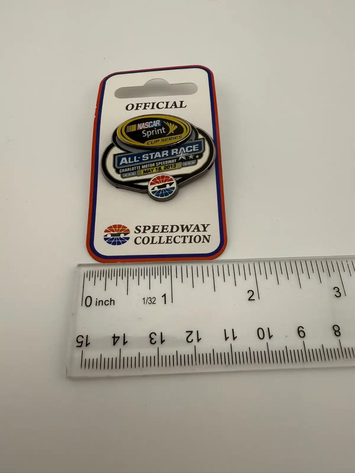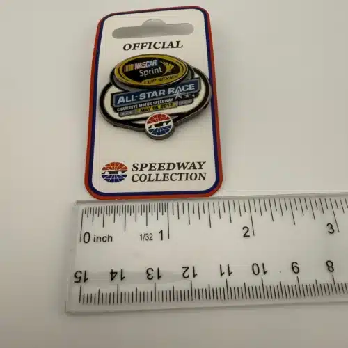 This pin commemorates the 2013 NASCAR Sprint Cup Series All-Star Race held at Charlotte Motor Speedway, an annual exhibition event featuring top drivers in a non-points competition. Pin measures just under 1 1/2 inch in width by approximately 1 1/4 inch in height.