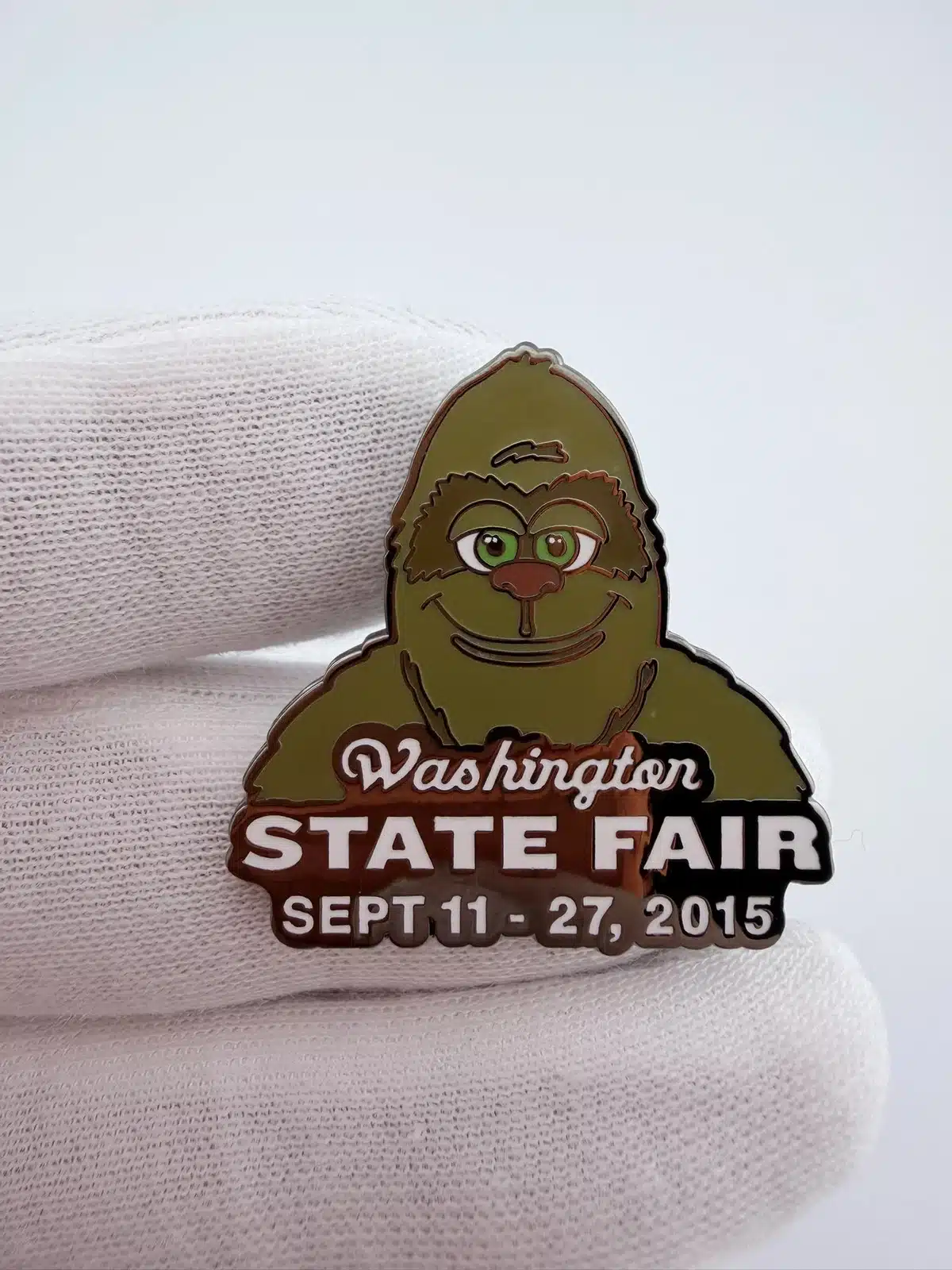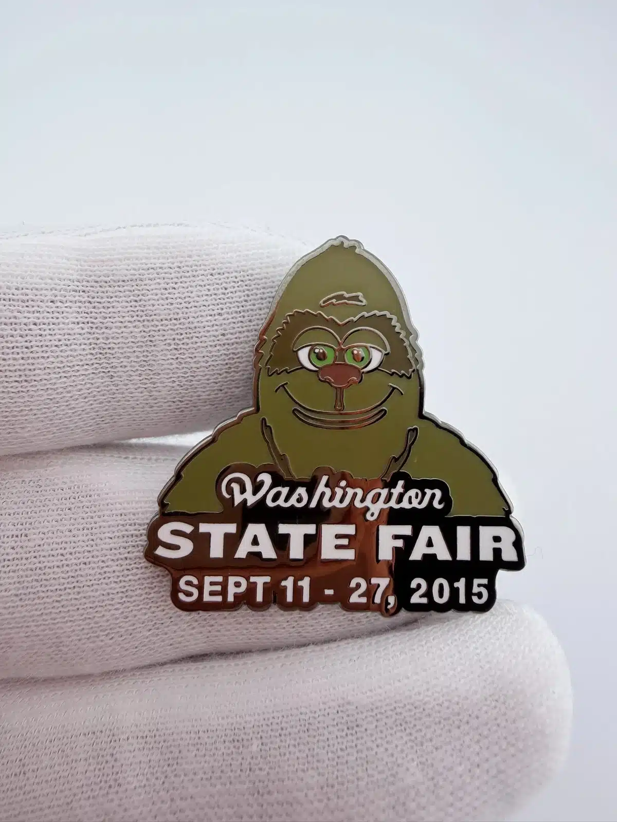 This pin showcases Big Washington, the green mascot of the 2015 Washington State Fair, depicted as a whimsical sasquatch-like figure. The playful character design captures the fair’s fun, family-friendly personality and Pacific Northwest flair.