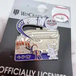 This pin commemorates the 2017 Opening Day at Coors Field, featuring a dynamic design of a baseball shooting out of the stadium. The baseball is prominently marked “Opening Day,” capturing the excitement surrounding the Colorado Rockies’ matchup against the Los Angeles Dodgers on 4-7-17.