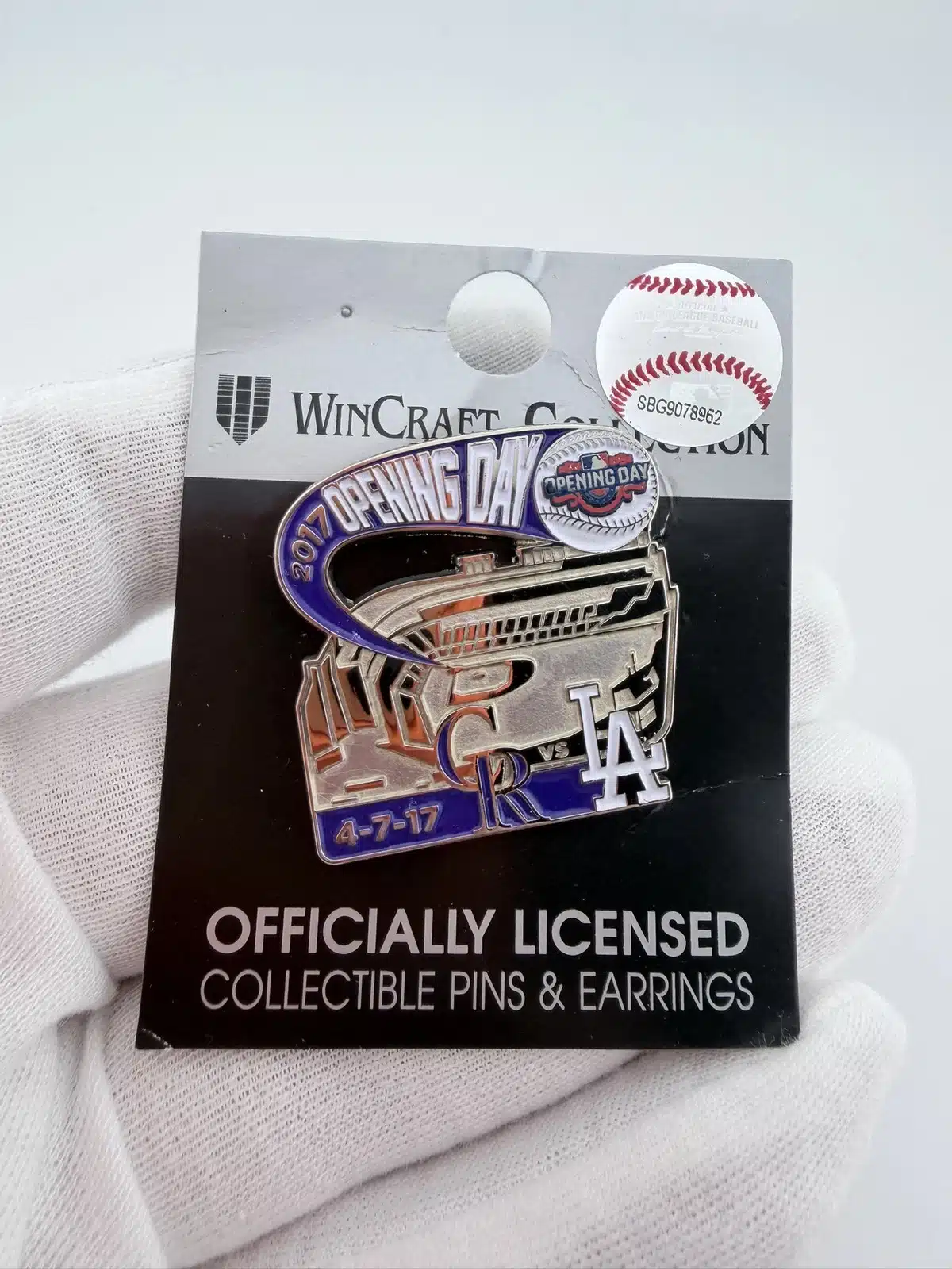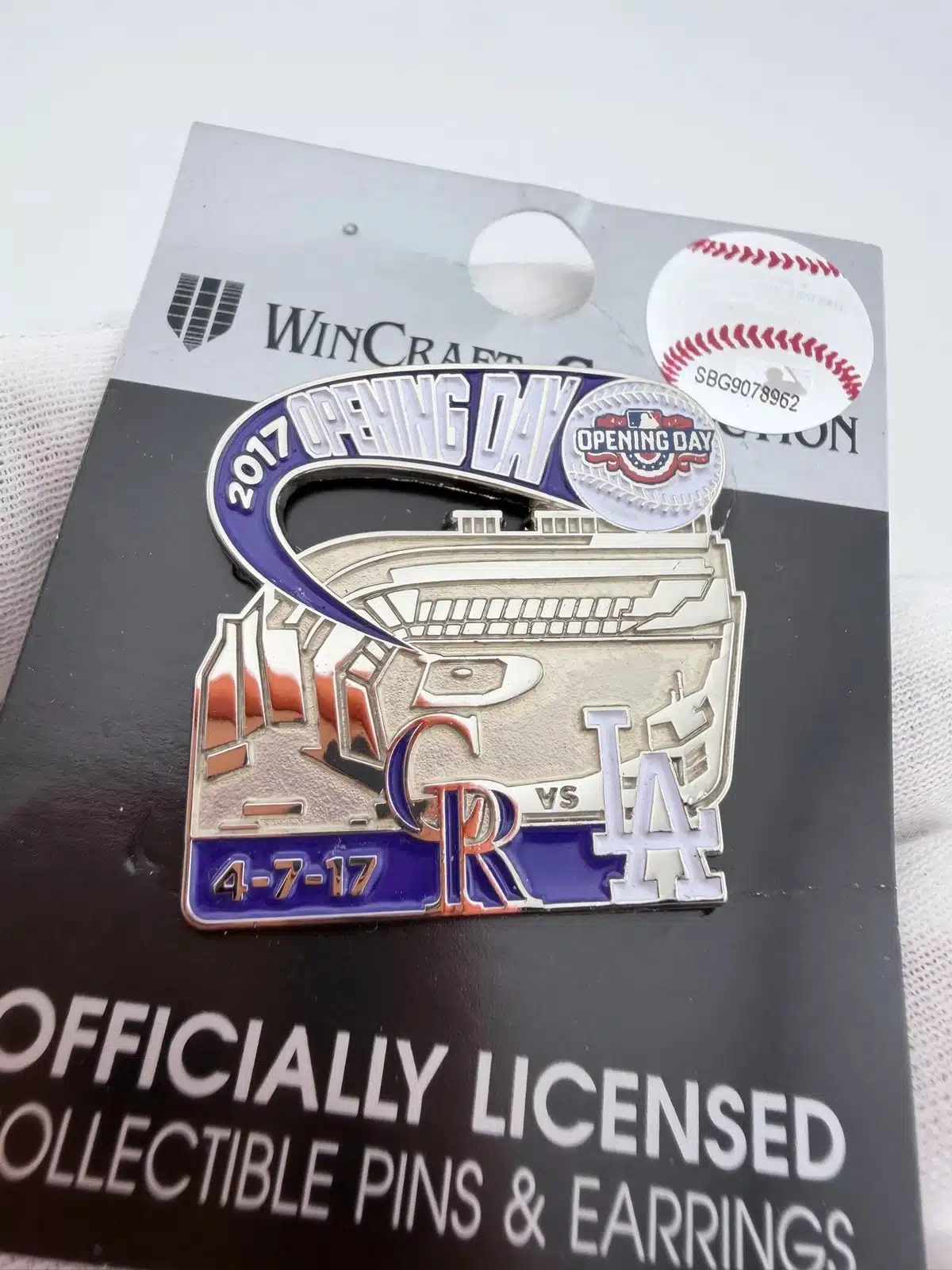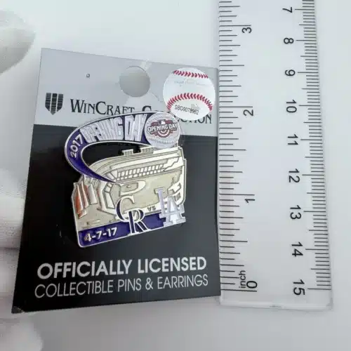 This pin commemorates the 2017 Opening Day at Coors Field, featuring a dynamic design of a baseball shooting out of the stadium. The baseball is prominently marked “Opening Day,” capturing the excitement surrounding the Colorado Rockies’ matchup against the Los Angeles Dodgers on 4-7-17.