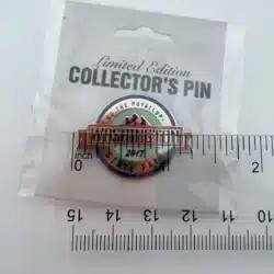 Behind the ribbon, a stylized mountain range rises into view, capturing the Pacific Northwest setting and the regional pride associated with this longtime annual event. Measuring approximately 1.25 inches in width and 1 inch in height, the pin has a noticeable presence while remaining easy to wear or display as part of a fair or Washington-themed collection.