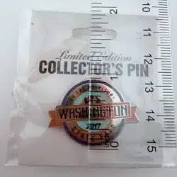 This circular pin commemorates the 2017 Washington State Fair, featuring a bold ribbon design across the center with the word “Washington” prominently displayed. At the top, the classic slogan “Do The Puyallup” is showcased, with “State Fair” positioned along the bottom, framing the design.