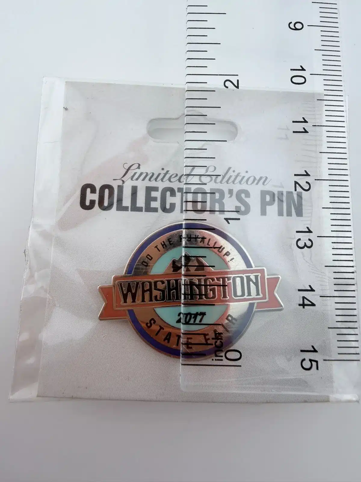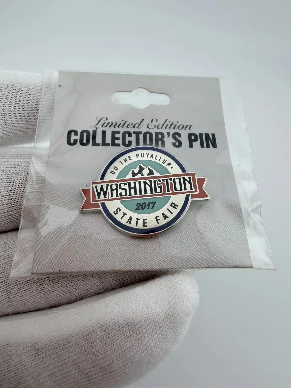 This circular pin commemorates the 2017 Washington State Fair, featuring a bold ribbon design across the center with the word “Washington” prominently displayed. At the top, the classic slogan “Do The Puyallup” is showcased, with “State Fair” positioned along the bottom, framing the design.