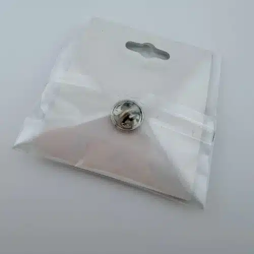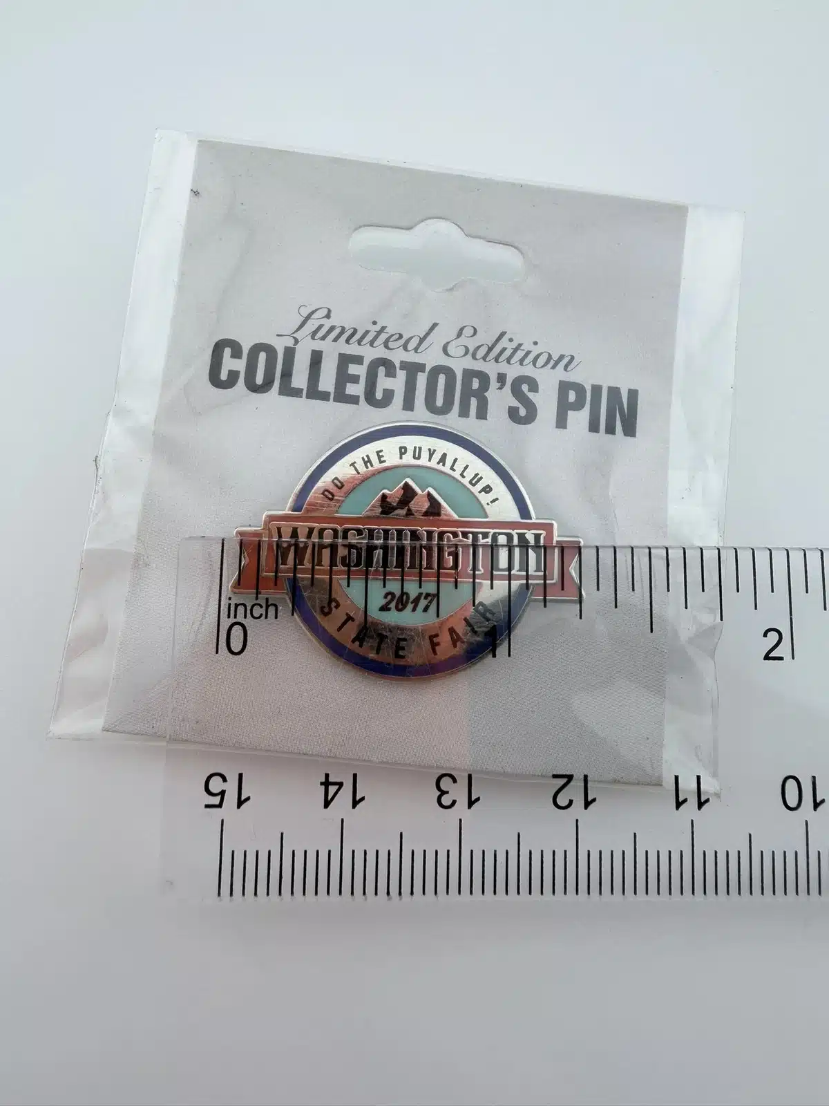 Behind the ribbon, a stylized mountain range rises into view, capturing the Pacific Northwest setting and the regional pride associated with this longtime annual event. Measuring approximately 1.25 inches in width and 1 inch in height, the pin has a noticeable presence while remaining easy to wear or display as part of a fair or Washington-themed collection.