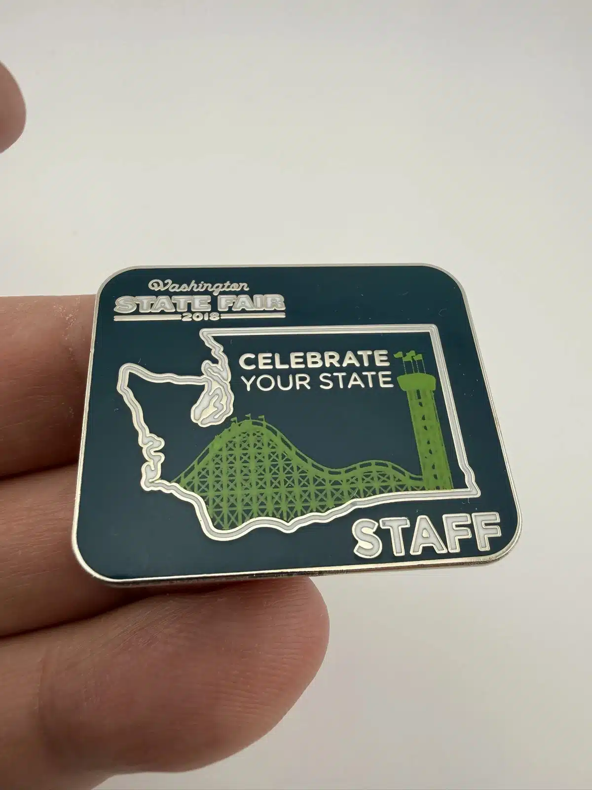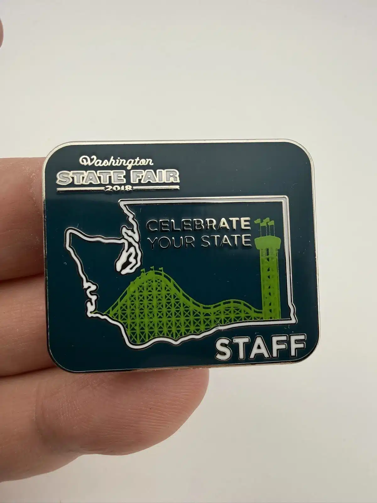 This 2018 Washington State Fair STAFF pin showcases the outline of Washington state, prominently featuring a green roller coaster and tower, symbolizing the fair’s attractions. The word ‘Staff’ is displayed in uppercase at the bottom right, indicating the role of the wearer during this annual event.