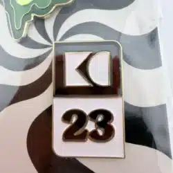 The second pin showcases a yellow and white flower design, adding a bright and uplifting visual element to the set. The clean lines and fresh color palette reflect themes of growth, creativity, and collaboration. Together, these two pins serve as keepsakes celebrating the 2023 employee convention and the company’s culture of innovation and connection.