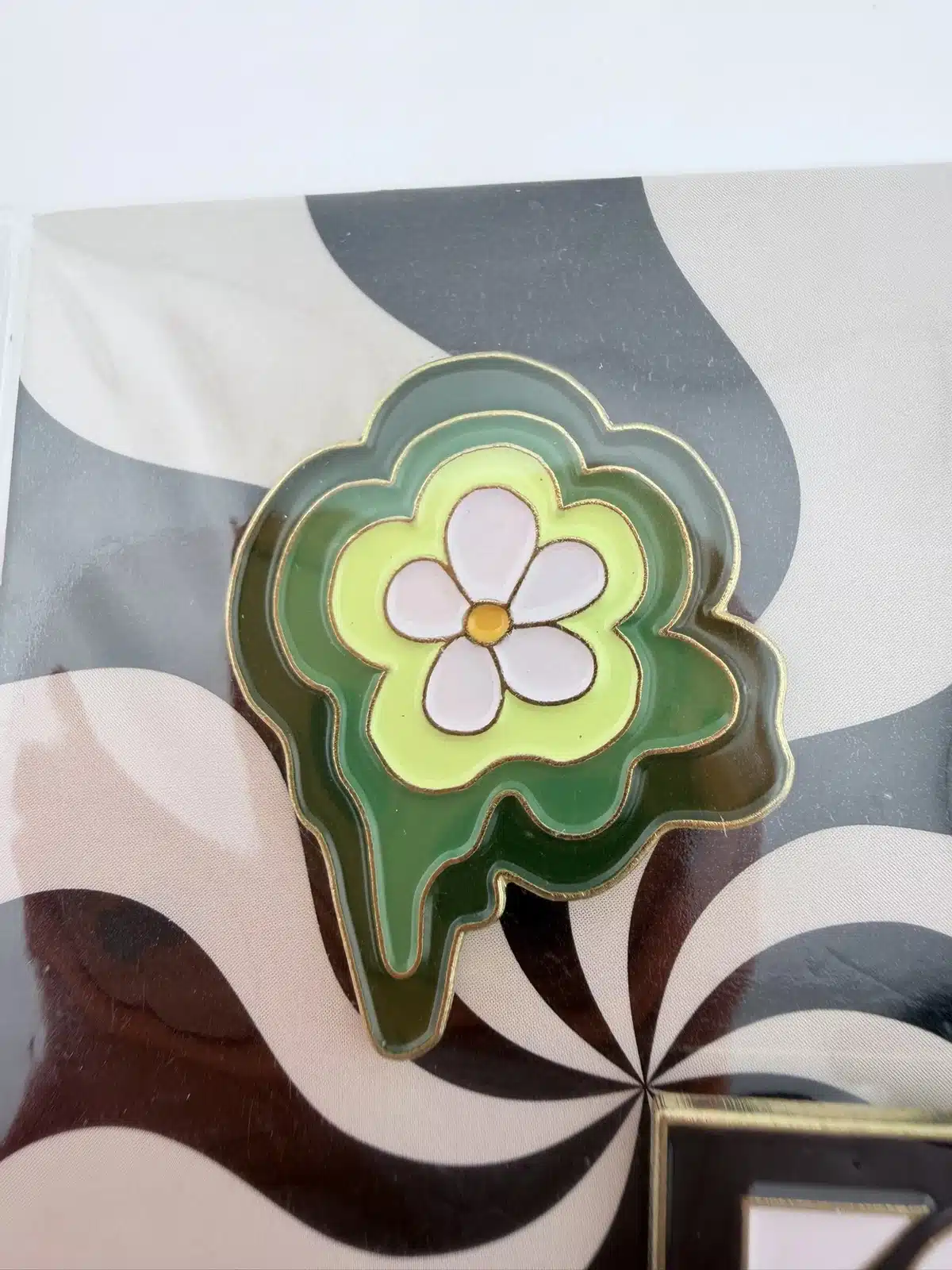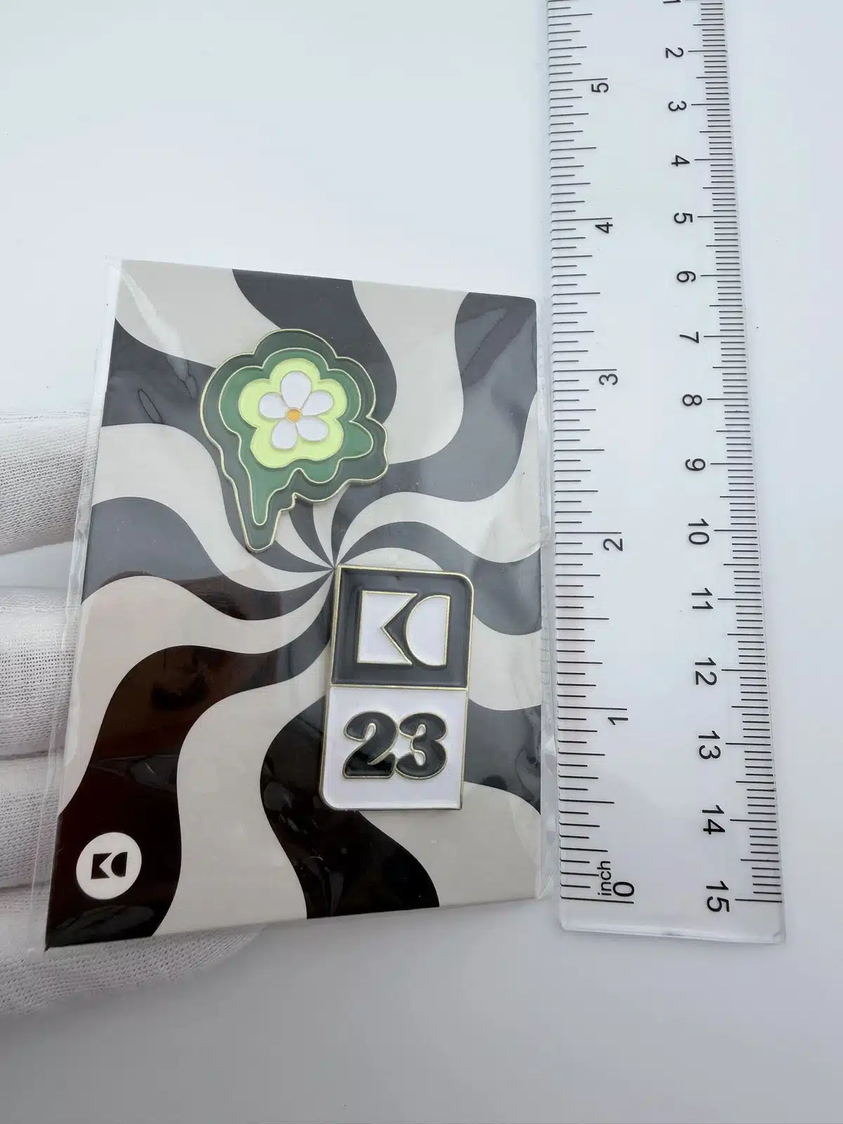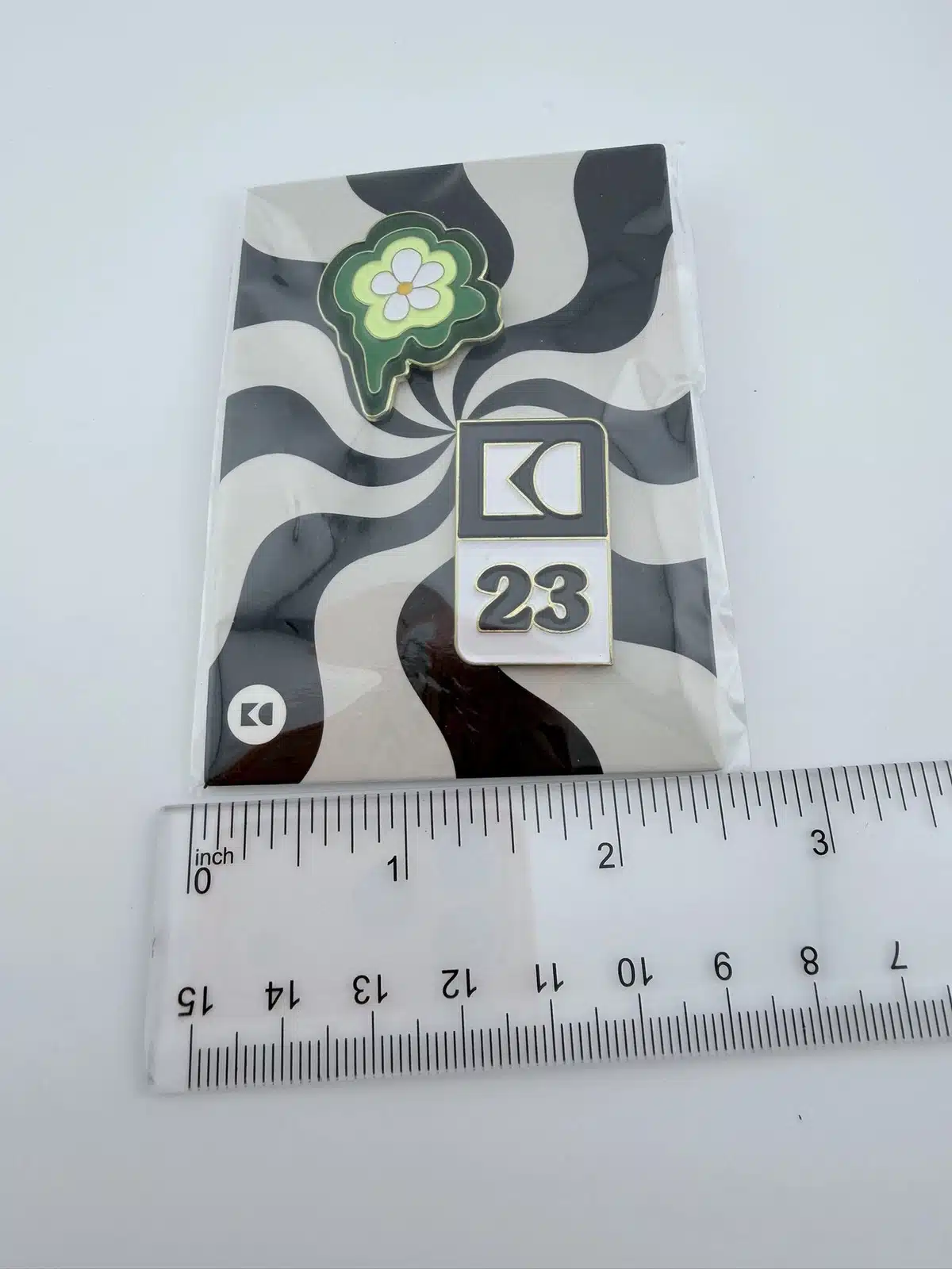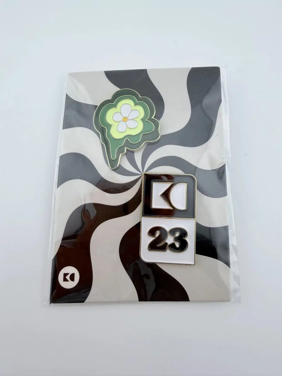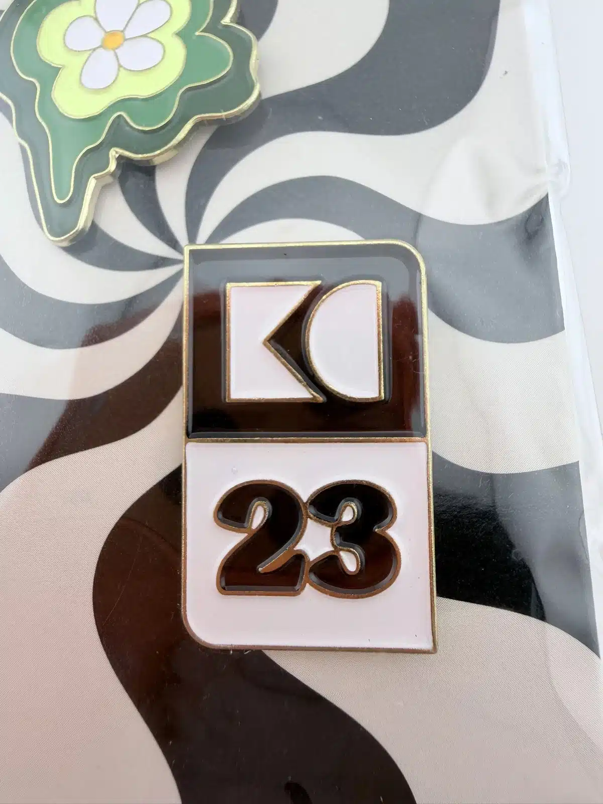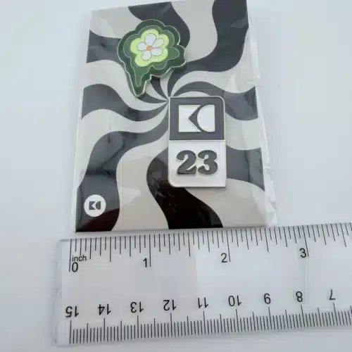 The second pin showcases a yellow and white flower design, adding a bright and uplifting visual element to the set. The clean lines and fresh color palette reflect themes of growth, creativity, and collaboration. Together, these two pins serve as keepsakes celebrating the 2023 employee convention and the company’s culture of innovation and connection.