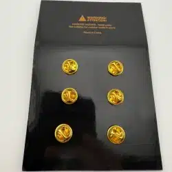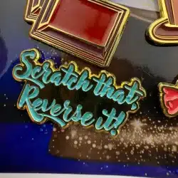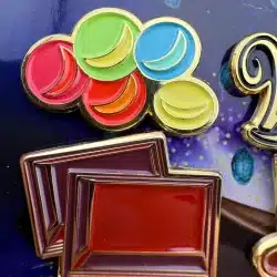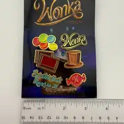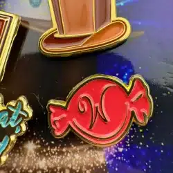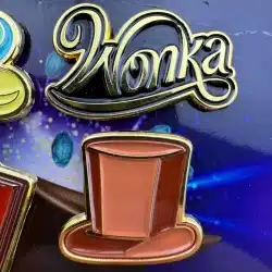 The 2023 Wonka Movie 6-Pin Promotional Set features vibrant designs including multi-colored candy, a chocolate bar, Wonka hat and more. Each pin is crafted to celebrate the whimsical essence of the film, making it a unique collectible for fans.