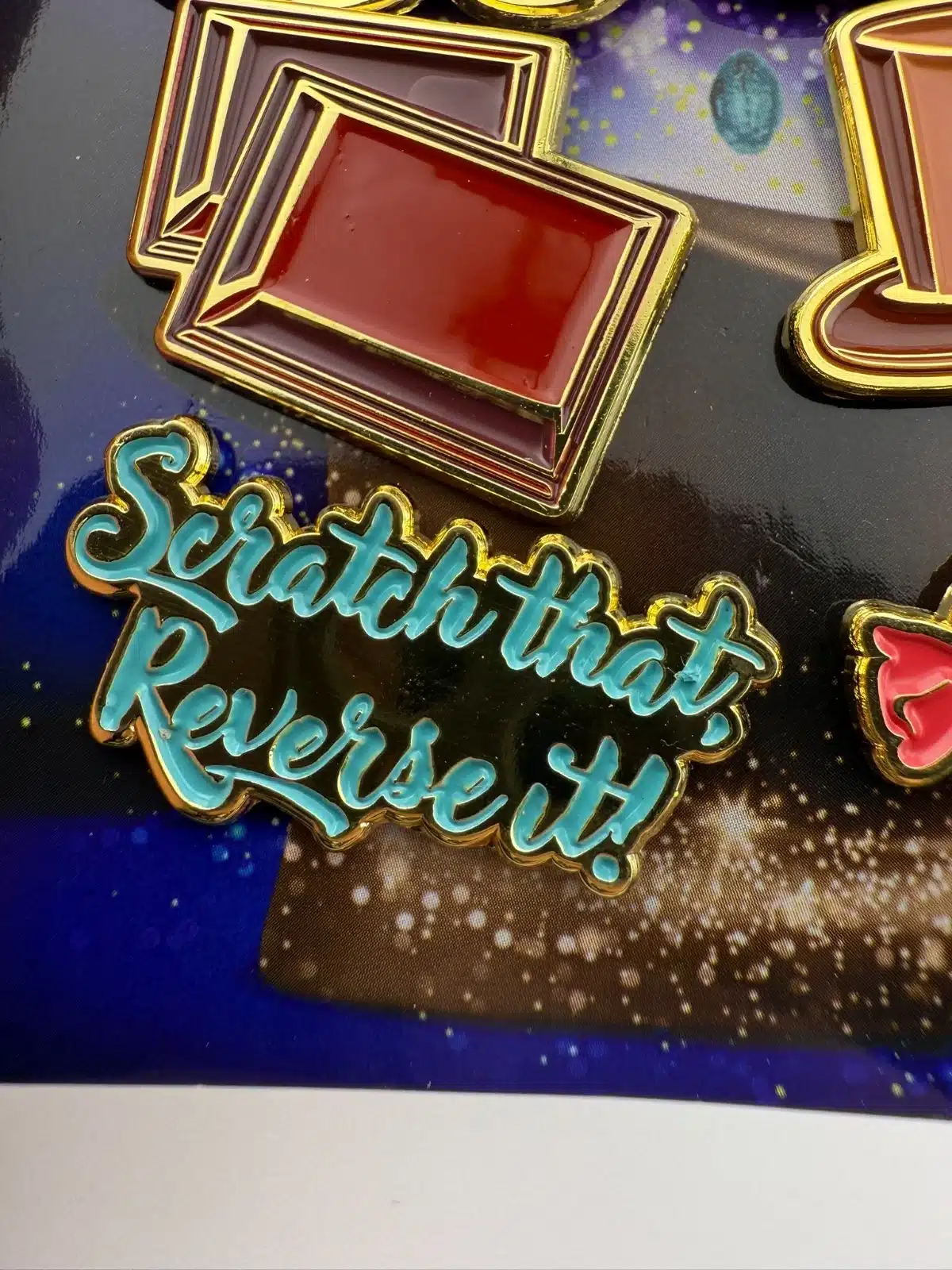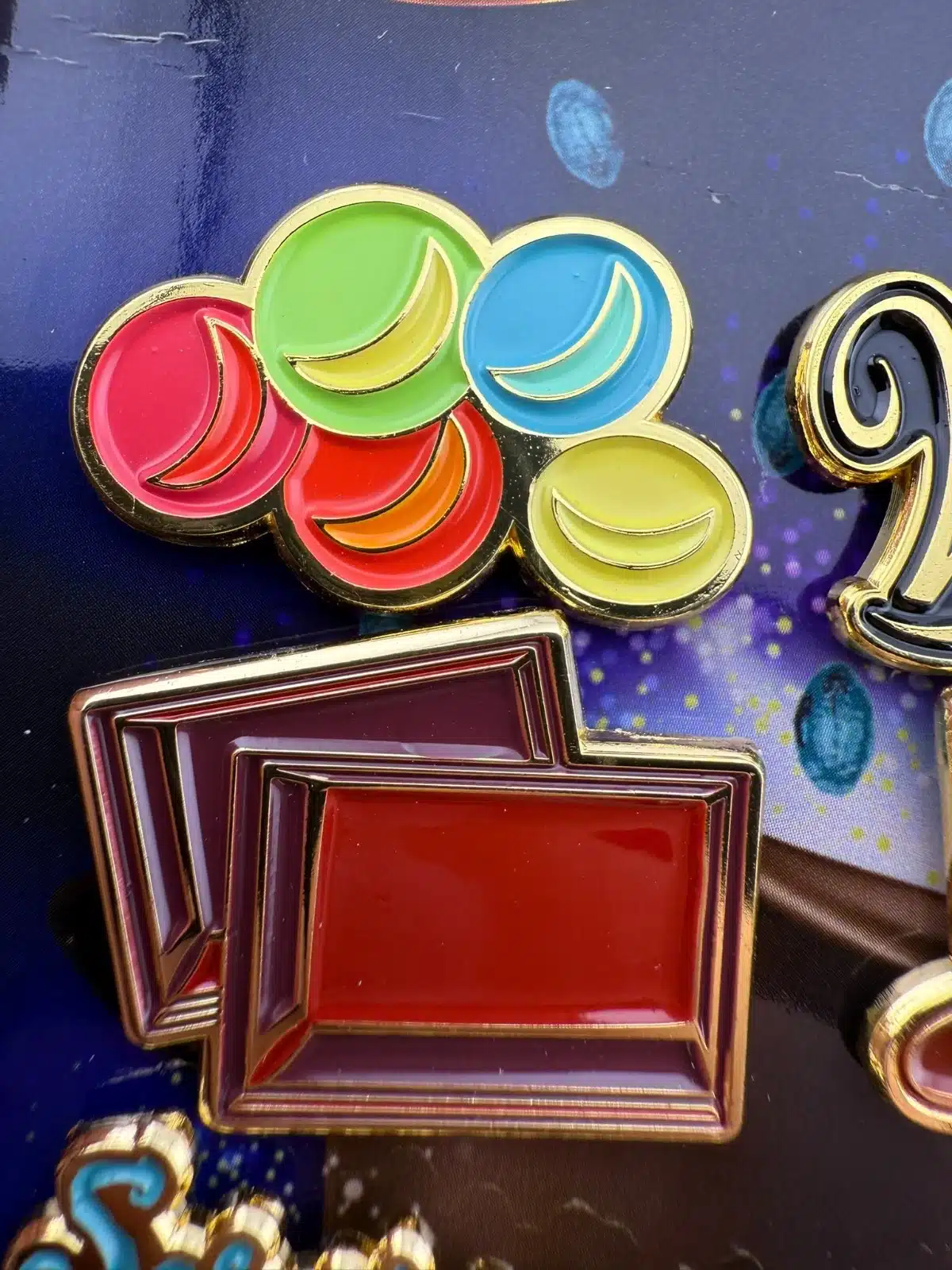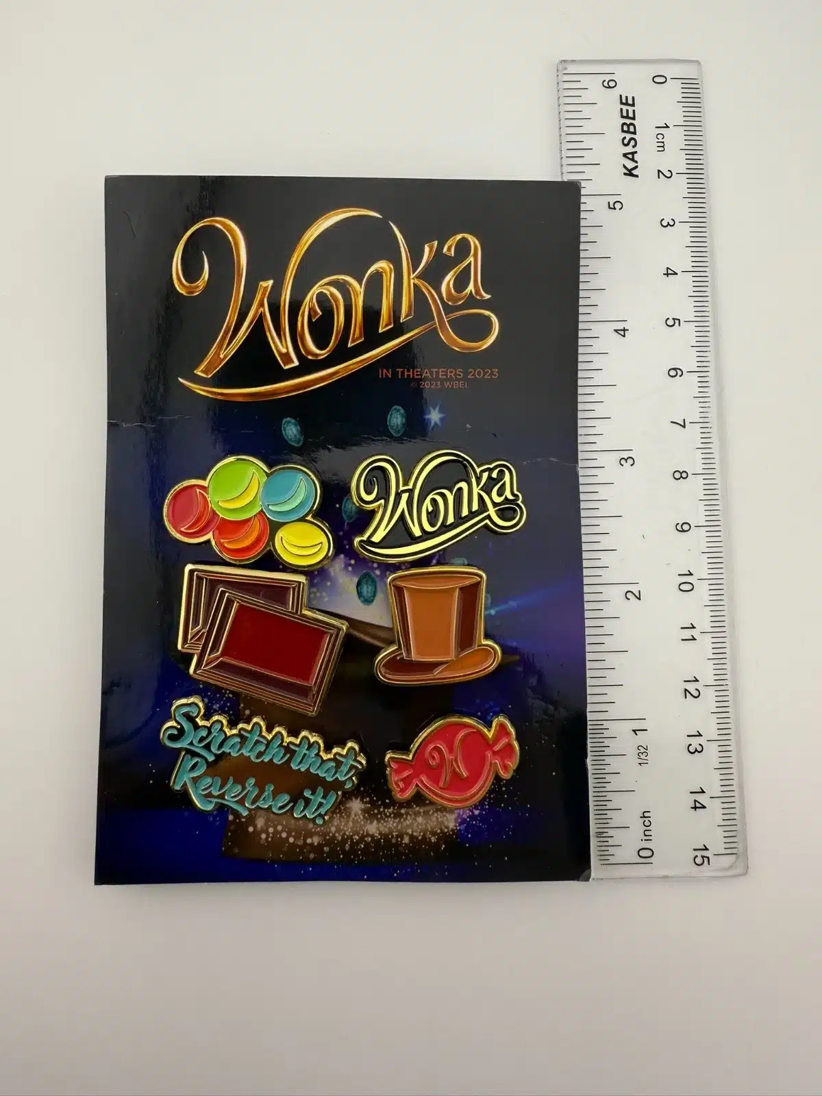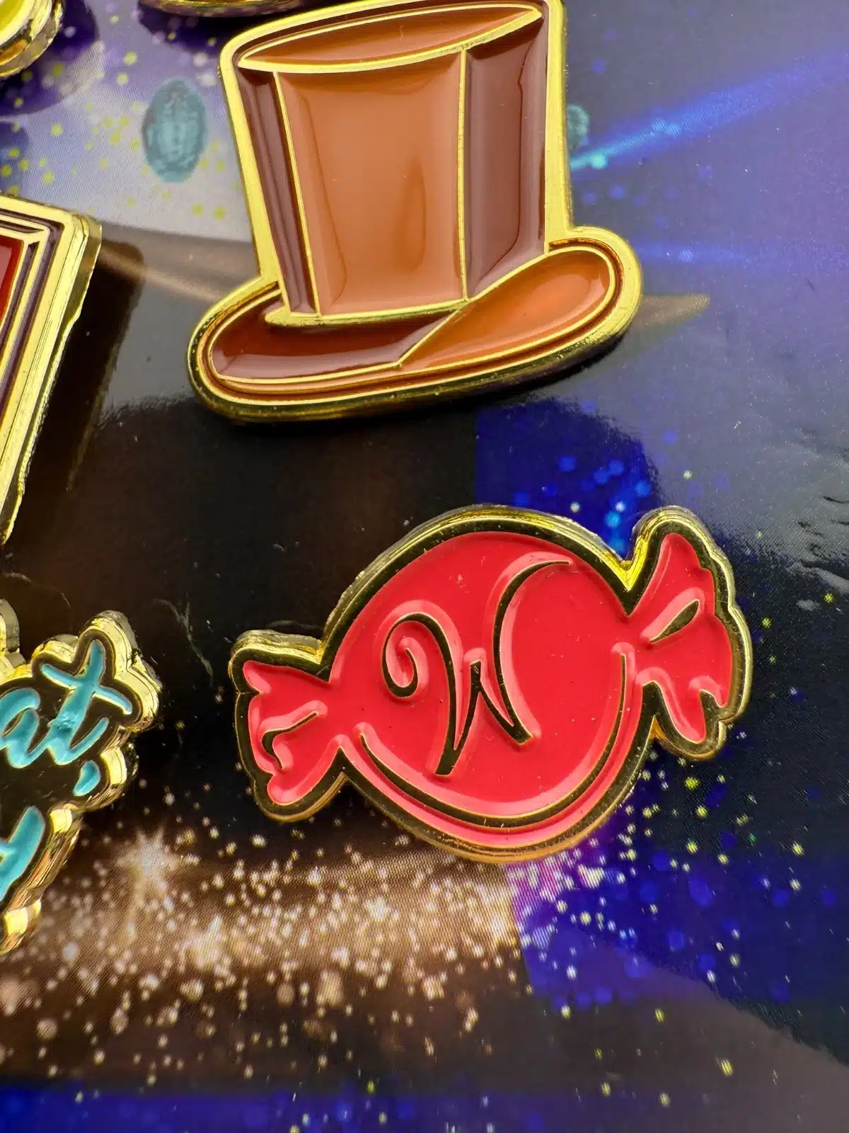 The 2023 Wonka Movie 6-Pin Promotional Set features vibrant designs including multi-colored candy, a chocolate bar, Wonka hat and more. Each pin is crafted to celebrate the whimsical essence of the film, making it a unique collectible for fans.