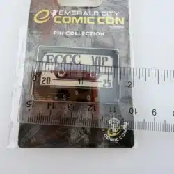 This 2025 Emerald City Comic Con lapel pin features a retro cassette tape design that nods to classic music and pop culture nostalgia. The label includes the acronyms ECCC and VIP, along with 20 and 25, tying the vintage motif directly to the event branding and its Seattle roots.