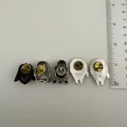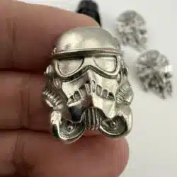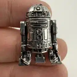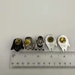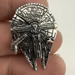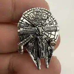 This collection features five iconic Star Wars pins, including a striking black Darth Vader, a silver-toned Stormtrooper, and R2-D2, alongside two Millennium Falcons. Each pin is marked with ‘LFL’ on the rear, indicating their official licensing by Lucasfilm. I believe these are all made of pewter.