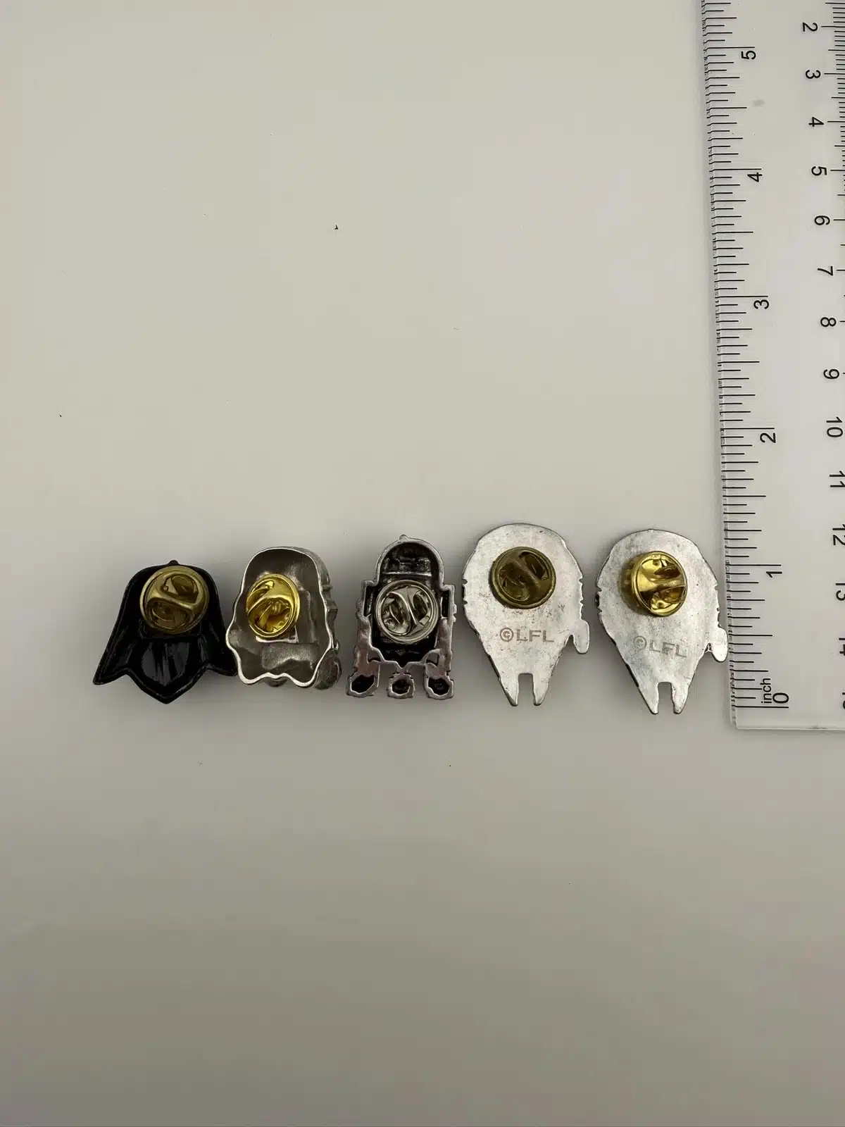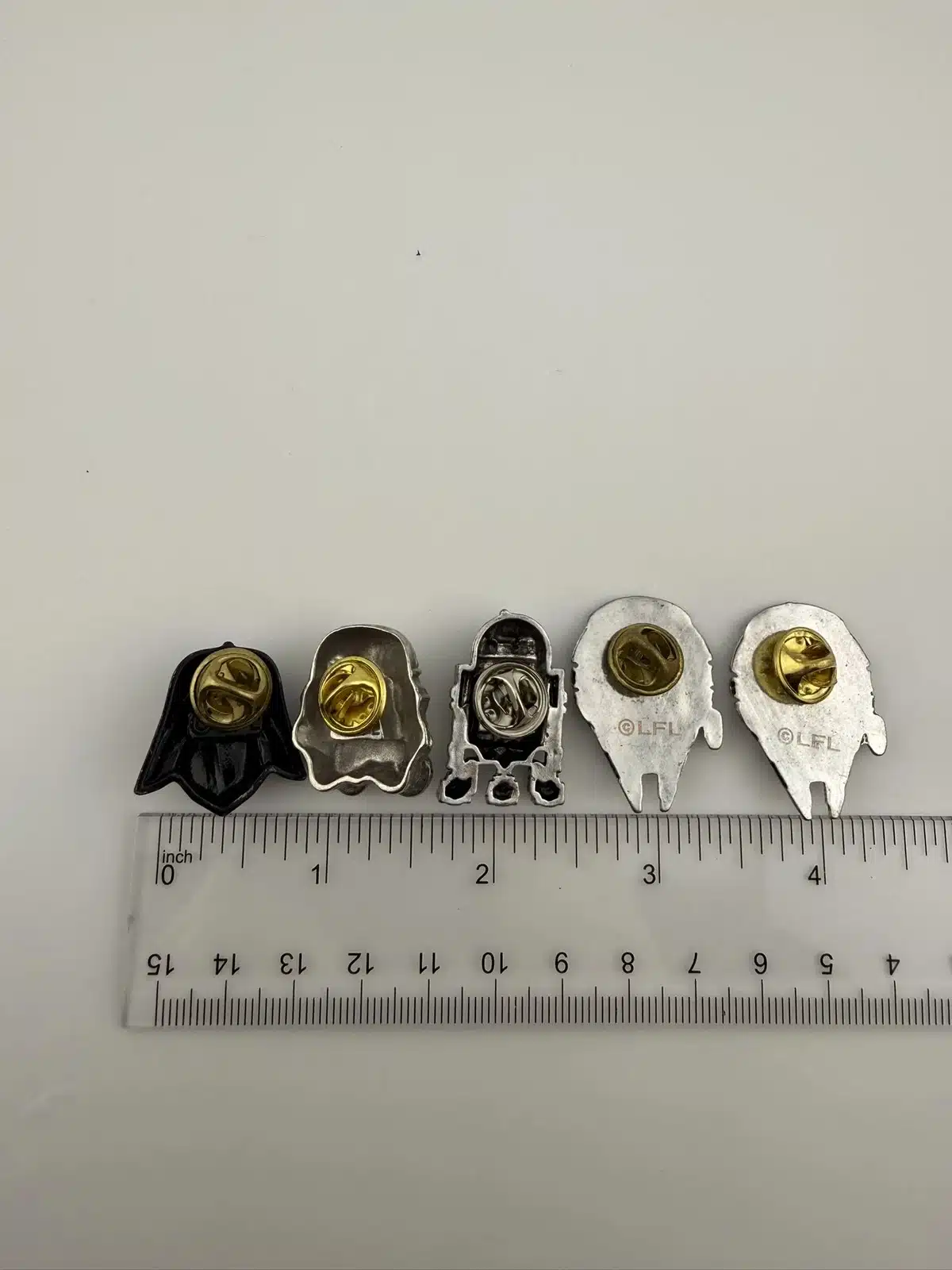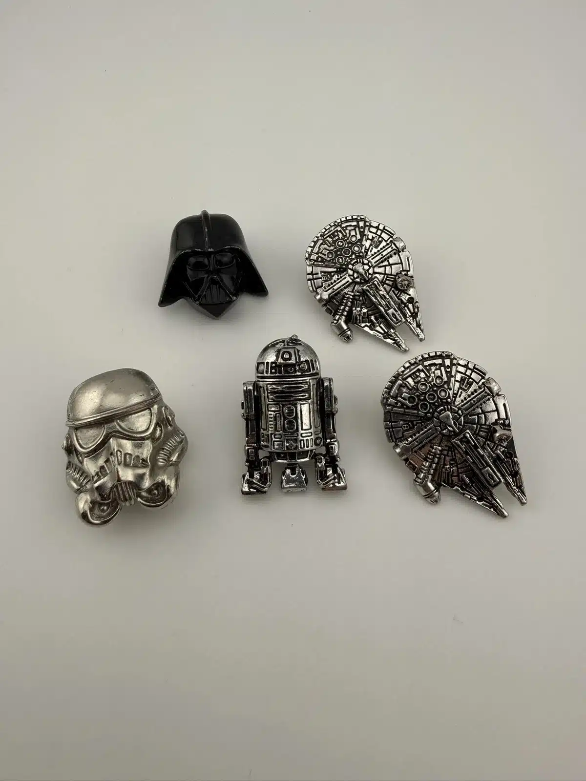 This collection features five iconic Star Wars pins, including a striking black Darth Vader, a silver-toned Stormtrooper, and R2-D2, alongside two Millennium Falcons. Each pin is marked with ‘LFL’ on the rear, indicating their official licensing by Lucasfilm. I believe these are all made of pewter.