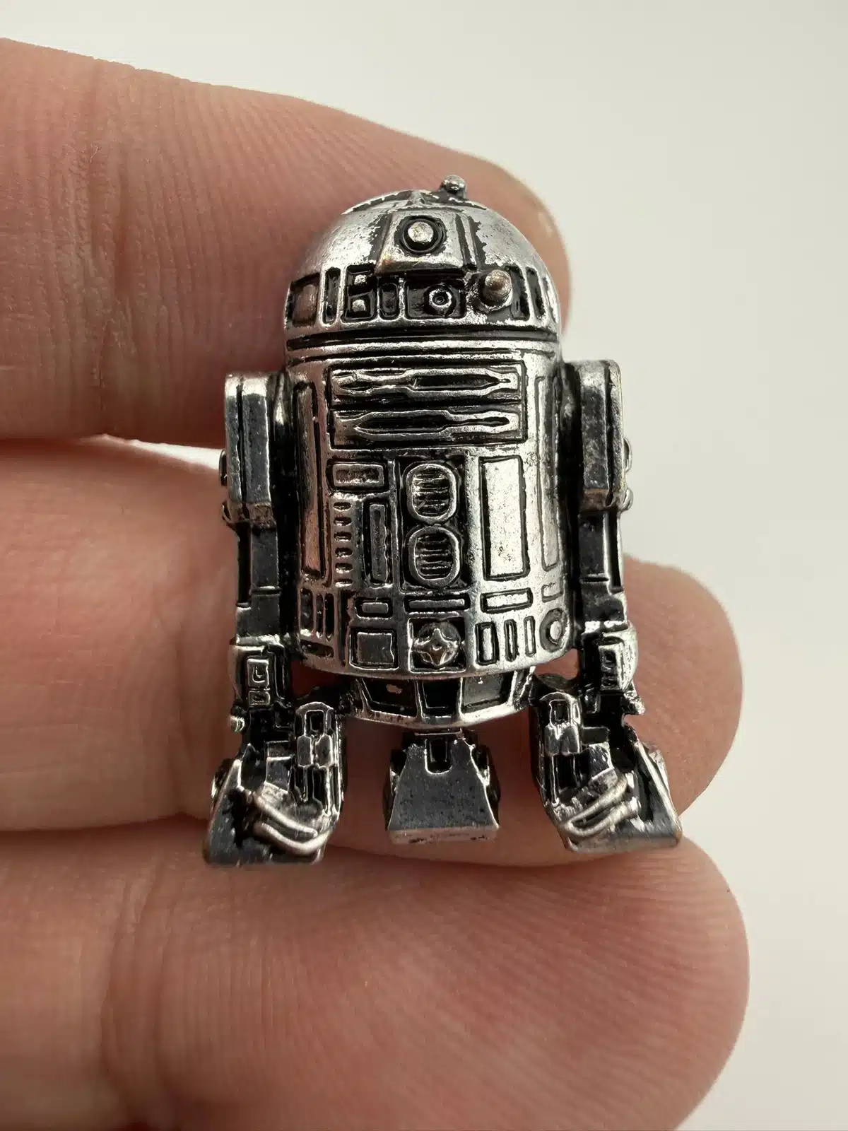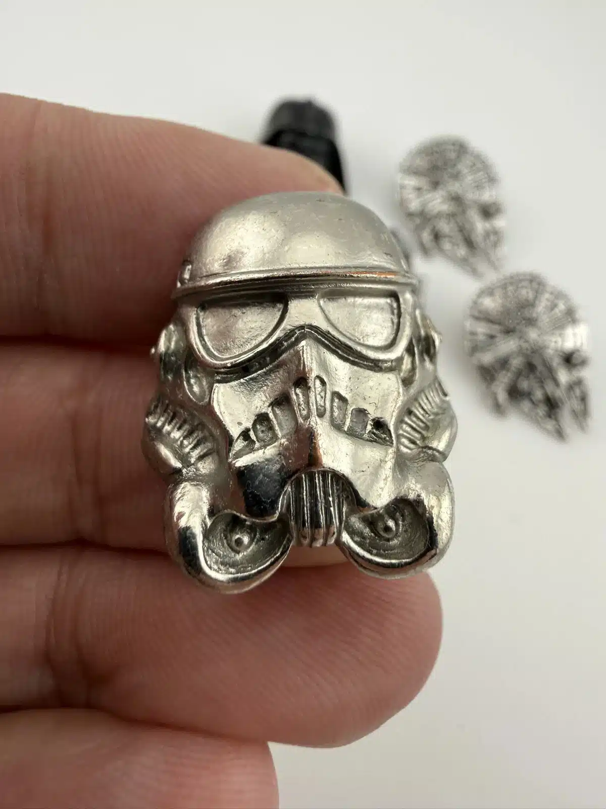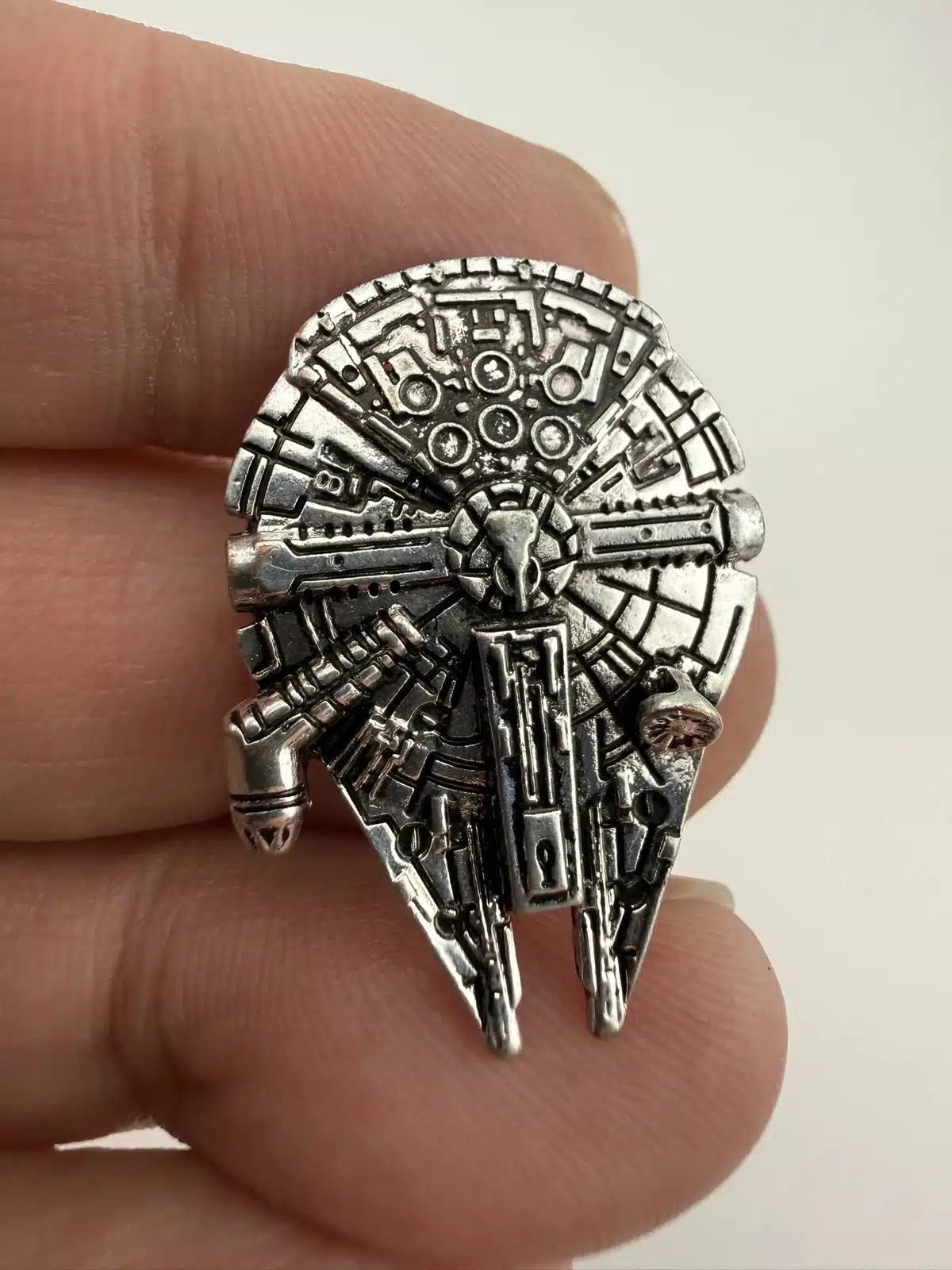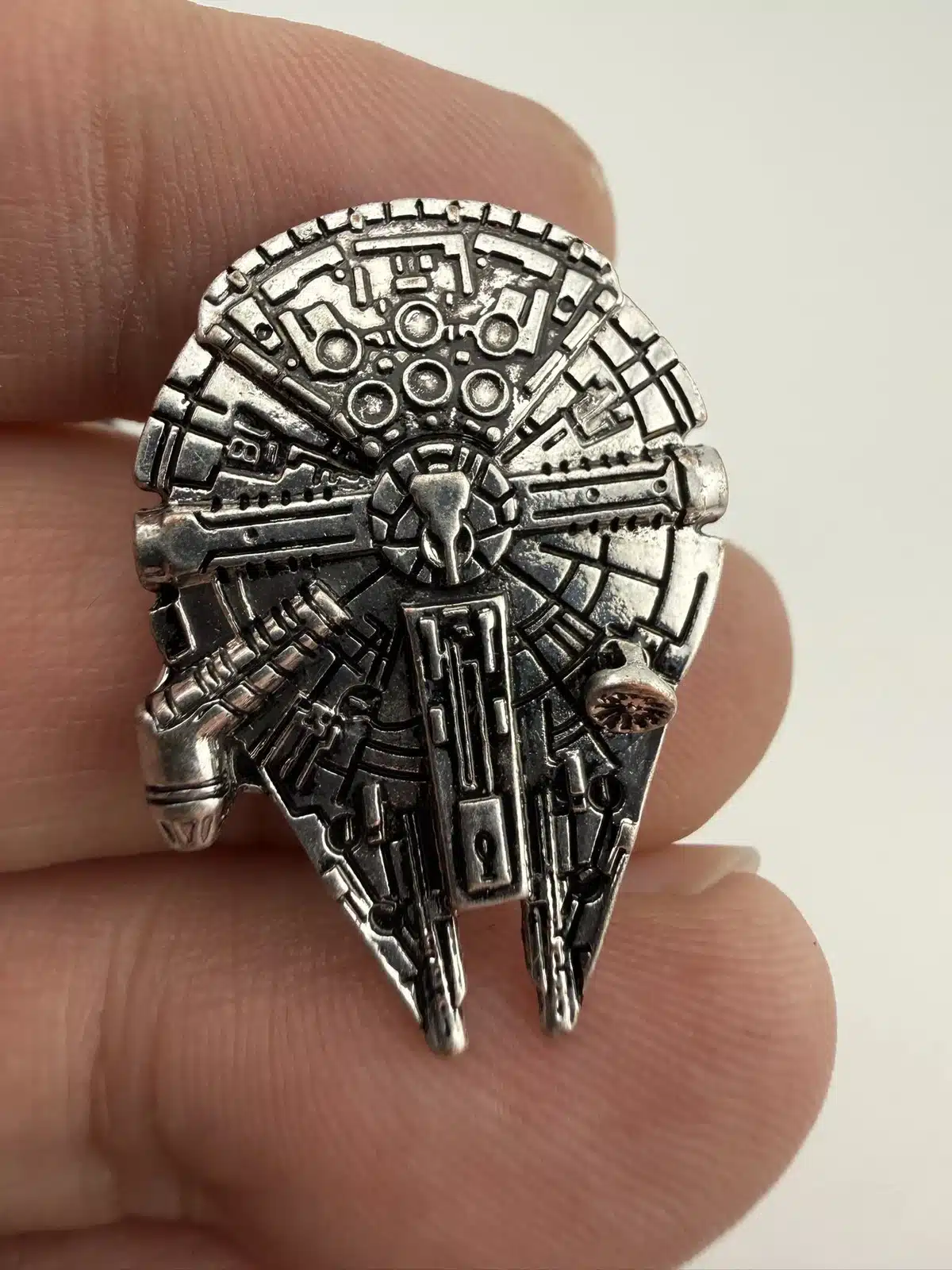 This collection features five iconic Star Wars pins, including a striking black Darth Vader, a silver-toned Stormtrooper, and R2-D2, alongside two Millennium Falcons. Each pin is marked with ‘LFL’ on the rear, indicating their official licensing by Lucasfilm. I believe these are all made of pewter.