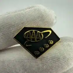 This pin features a diamond shape with a striking black background and the AAA logo rendered in gold tone, symbolizing excellence in automotive services. Accompanying the logo are four small diamond-shaped emblems, enhancing the beauty of this American Automobile Association’s award pin.