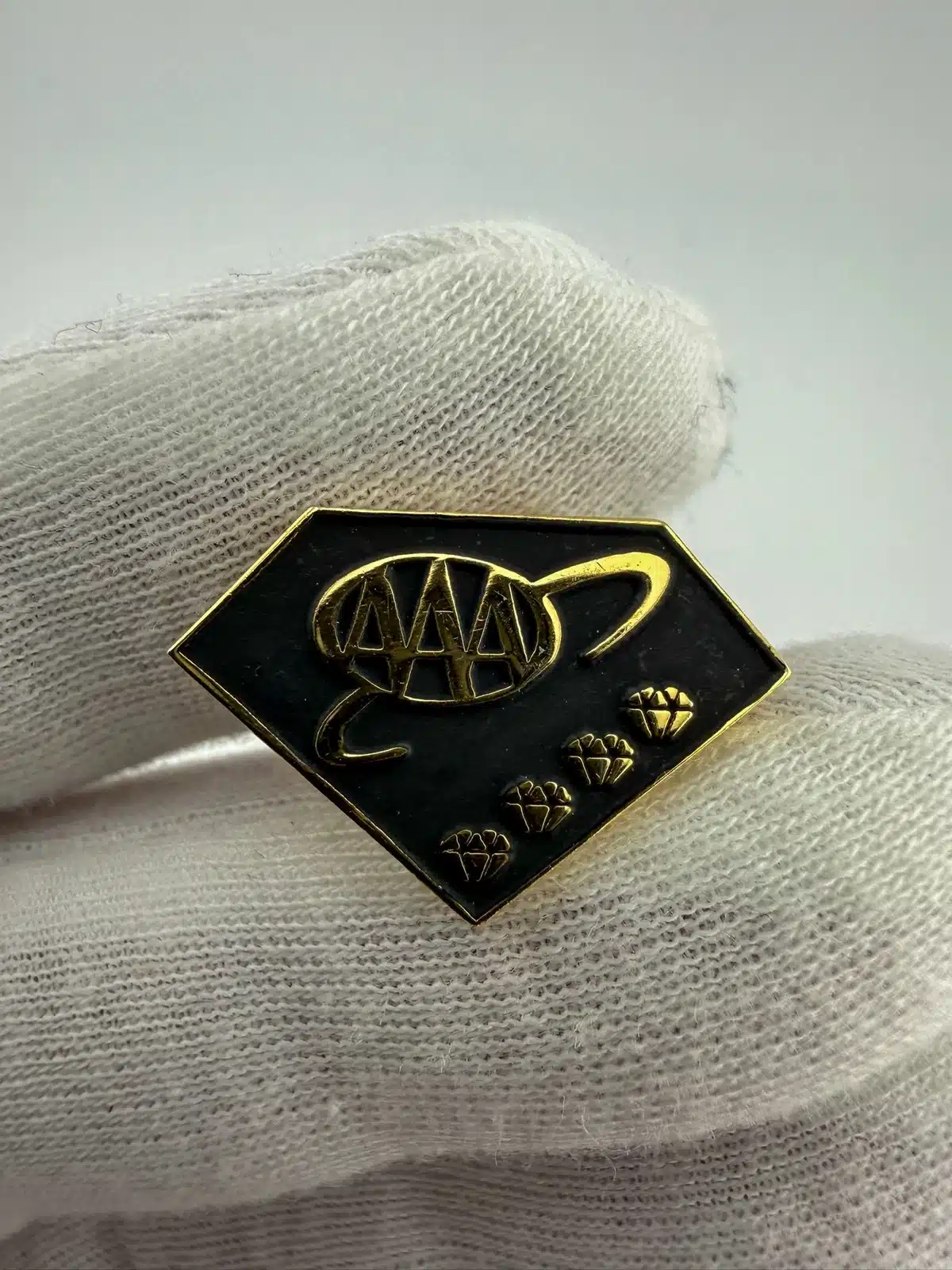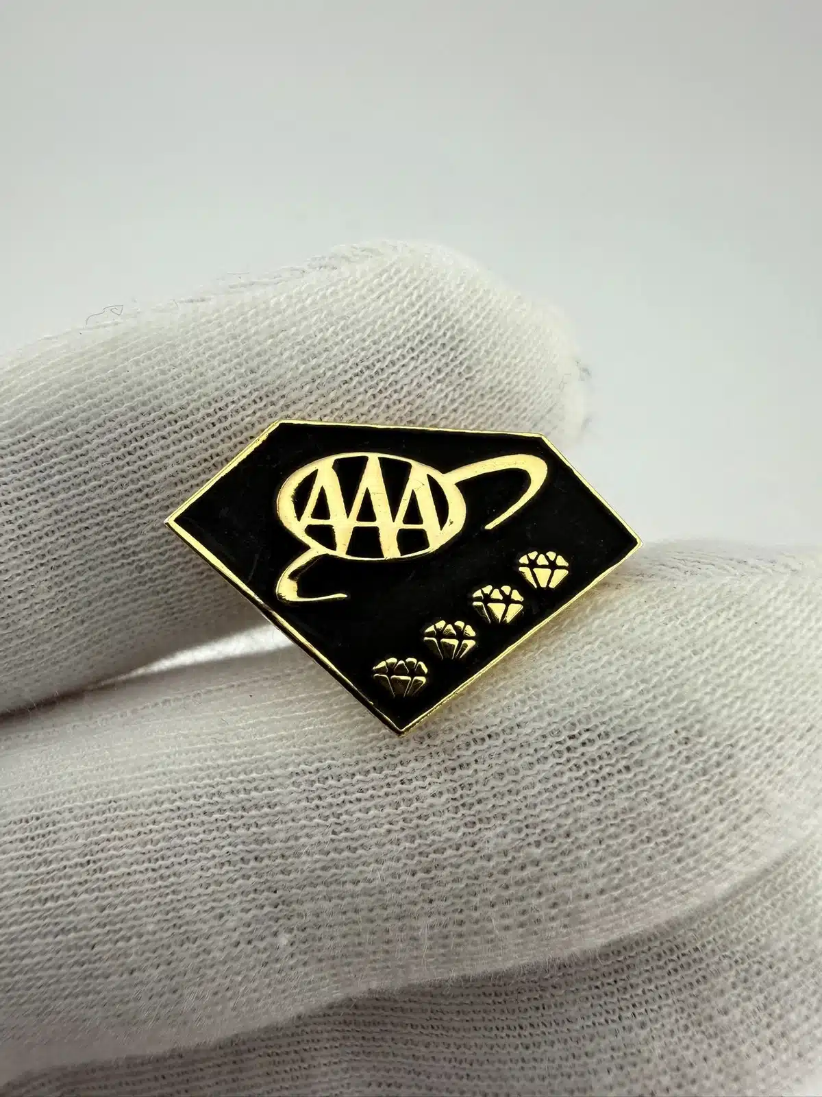 This pin features a diamond shape with a striking black background and the AAA logo rendered in gold tone, symbolizing excellence in automotive services. Accompanying the logo are four small diamond-shaped emblems, enhancing the beauty of this American Automobile Association’s award pin.