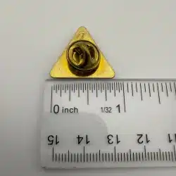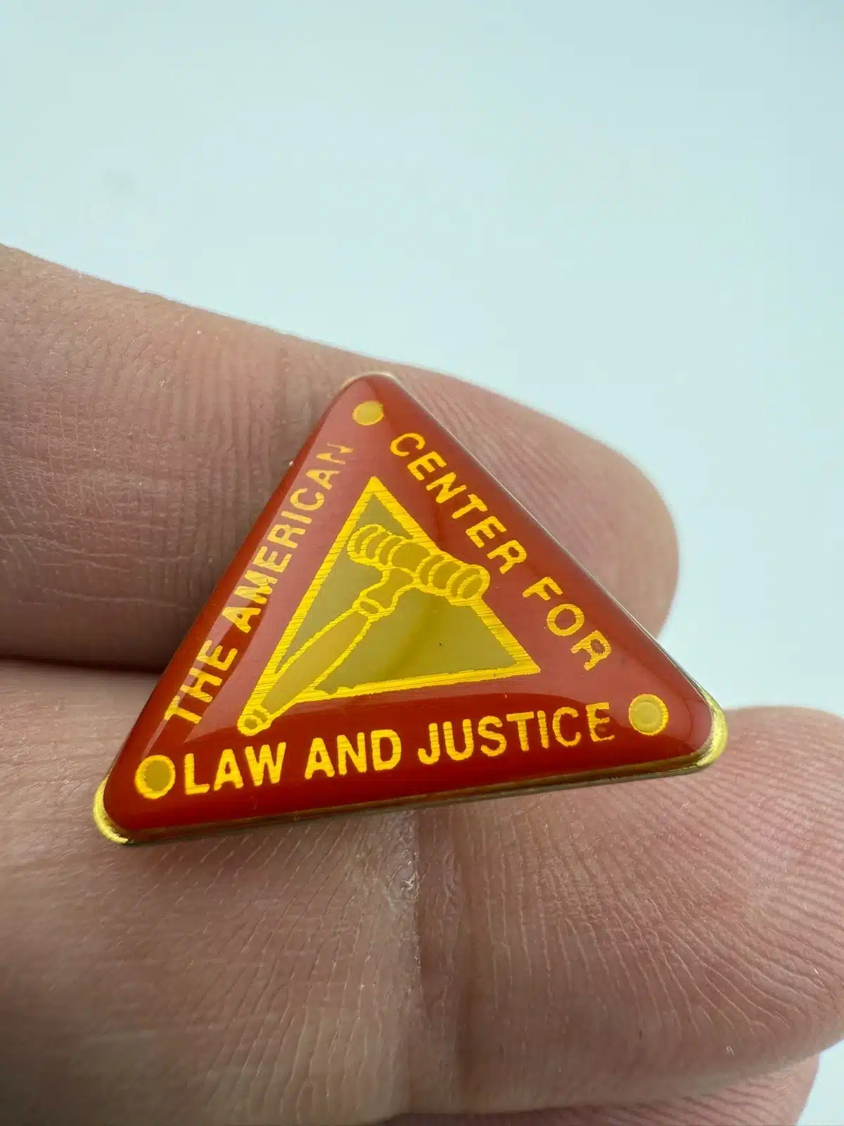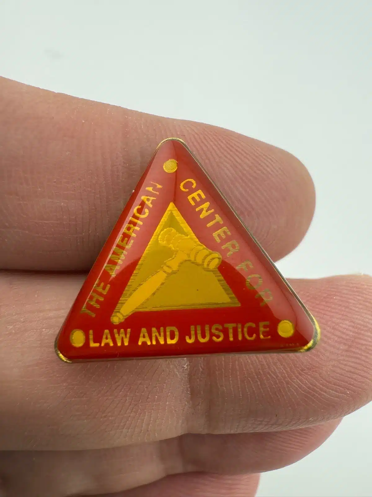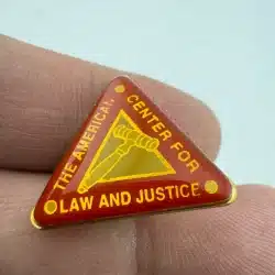 This pin is triangular in shape and features a red background with a gavel over an inner triangle design at the center. The outer edge includes the text American Center for Law and Justice, arranged to follow the triangular layout.