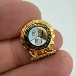 Featuring a two-piece design, this pin has a circular AIW emblem at the top divided into sections with the letters “A,” “I,” and “W” arranged within the circle. Around the outer edge it reads “International Union Allied Industrial Workers of America,” with a separate hanging charm below that reads “Retired.”