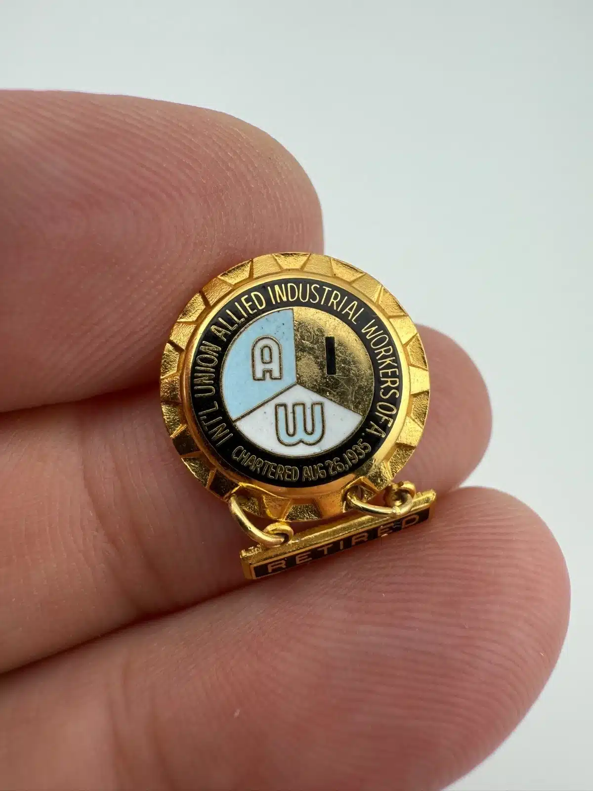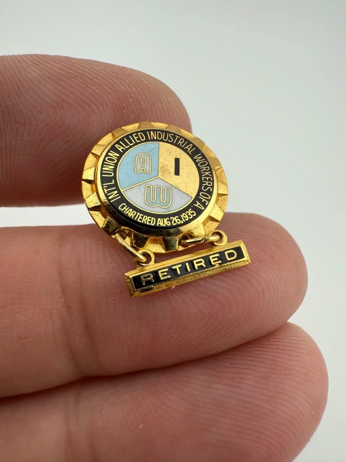 Featuring a two-piece design, this pin has a circular AIW emblem at the top divided into sections with the letters “A,” “I,” and “W” arranged within the circle. Around the outer edge it reads “International Union Allied Industrial Workers of America,” with a separate hanging charm below that reads “Retired.”